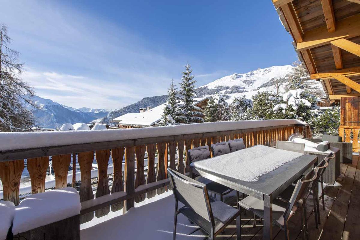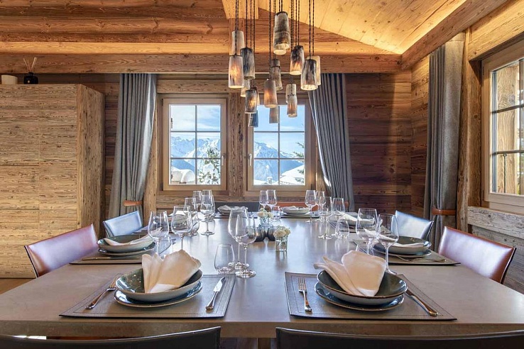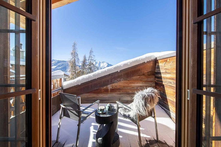 Following dinner, the south-facing balcony beckons for a breath of fresh mountain air, providing an ideal setting to enjoy a drink while witnessing the sunset over Verbier's mountain panorama.