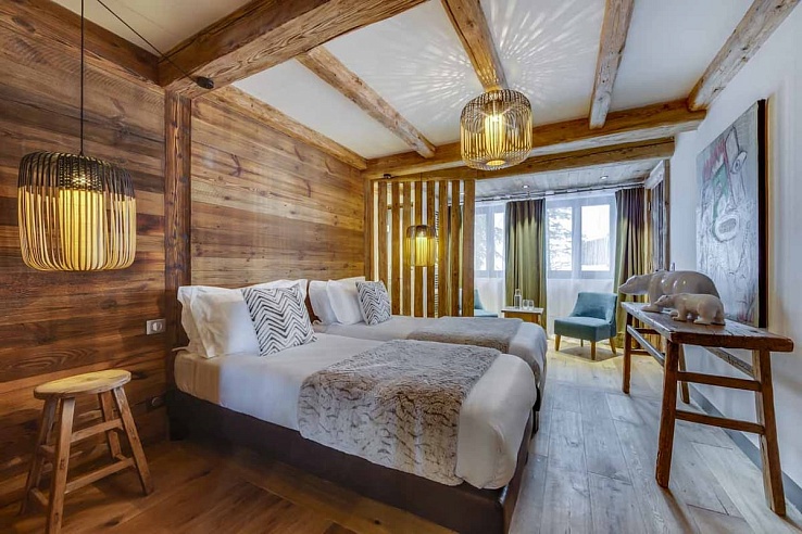 The chalet boasts seven en-suite bedrooms adorned with reclaimed and natural Vanoise stone tiles, configurable as twin or double rooms. Each bedroom includes its own en-suite bathroom or shower room.
