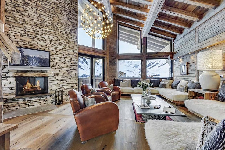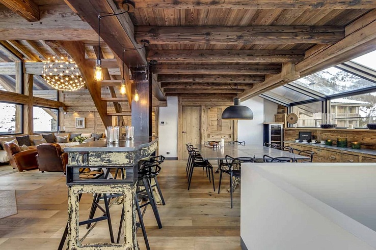 Spread across five floors, Val-209 accommodates up to 14 guests. It features a welcoming open-plan living and dining area with a fireplace, ample seating, and breathtaking mountain views visible through double-height windows and from a heated terrace. A mezzanine level offers additional relaxation space.