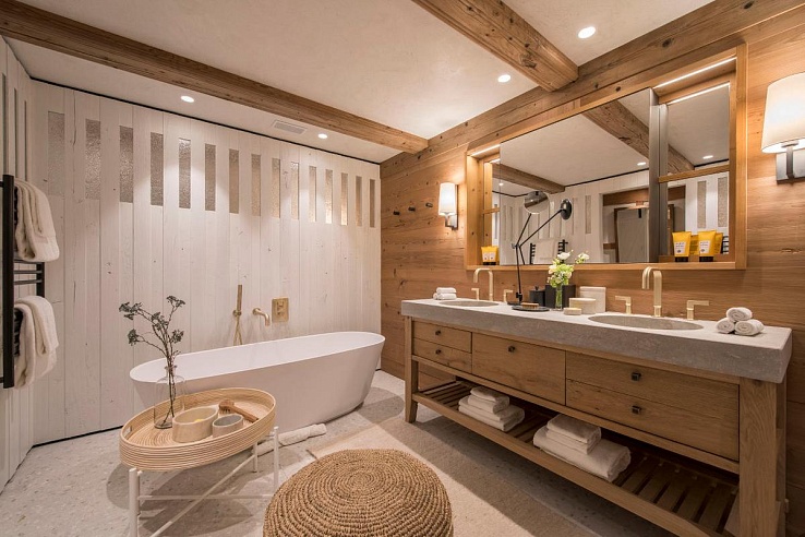 The zenith of relaxation awaits on the topmost level with a chic spa featuring a hot tub, hammam, and a serene massage chamber. For cinematic indulgence, the lower ground level houses a dedicated home theater and bar. Guests are also privileged with access to a shared gymnasium, a facility harmoniously enjoyed among the 7 Heaven chalets.