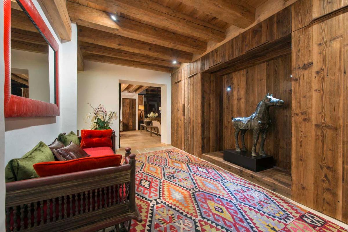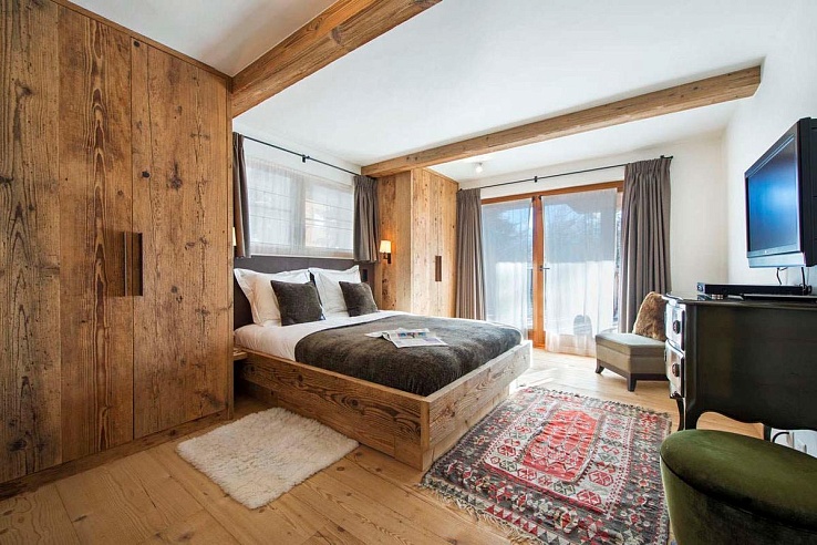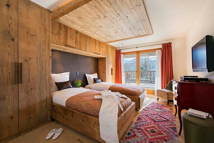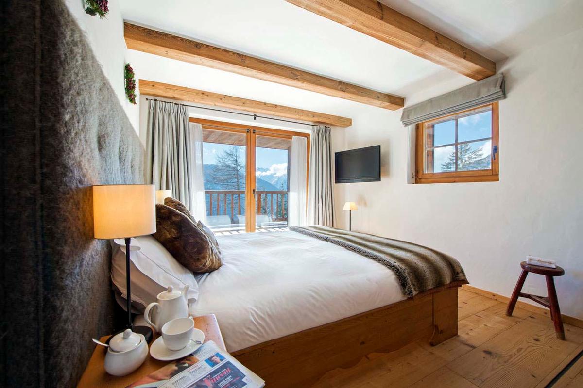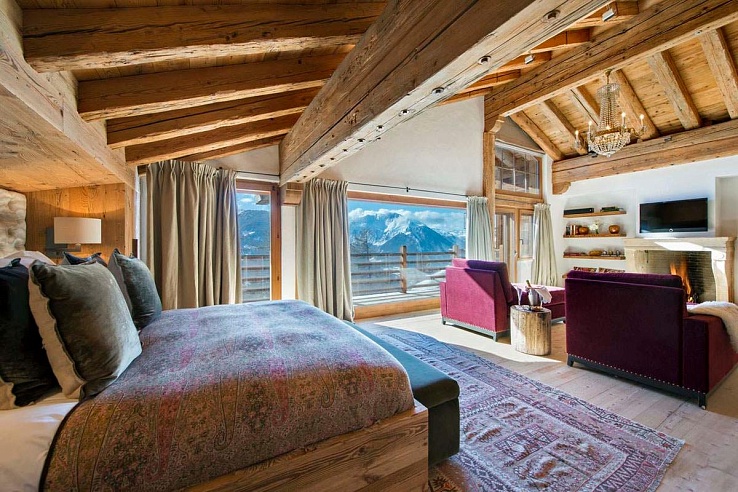 The chalet is perfect for large groups or families, including three double bedrooms, two twin rooms, and a quad bunk room. The top-floor master suite, with its fireplace, sitting area, and balcony, is a standout feature.