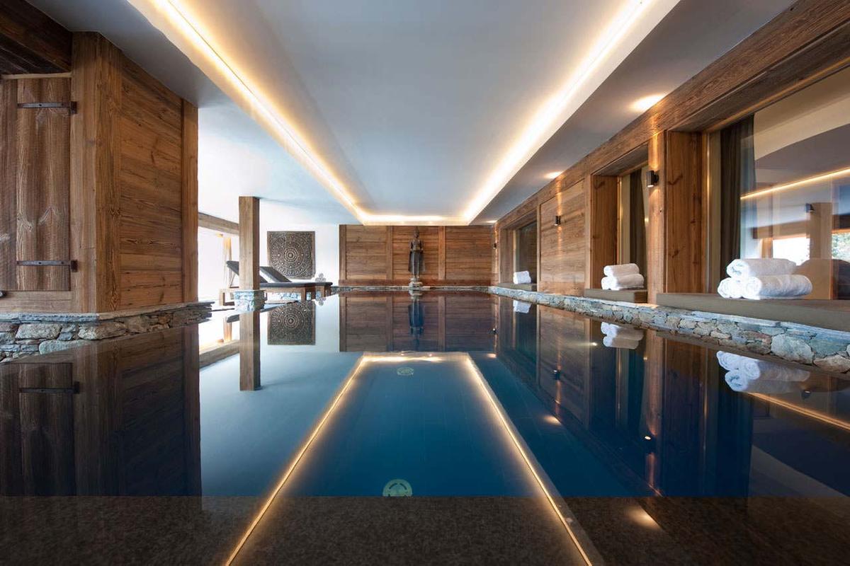 The ground floor boasts a stunning spa area with panoramic views, featuring a heated pool, steam room, outdoor hot tub, sauna, and fitness room.