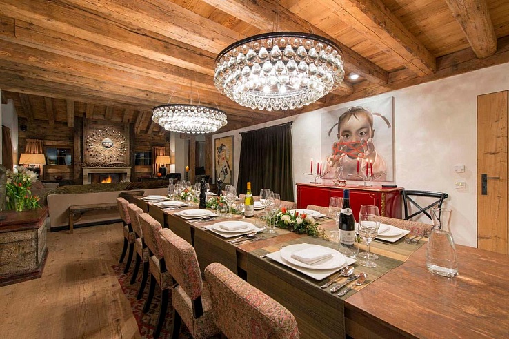 The chalet combines authentic materials reflecting local architecture with a modern touch, featuring contemporary art and furniture for an alpine chic aesthetic. Ascending to the second floor, where you'll find a bright and spacious open-plan living and dining area awaits, along with a separate kitchen. Unwind by the roaring log fire on the plush sofas, or come together at the large wooden dining table, ideally situated near the balcony offering stunning views of snow-capped peaks.