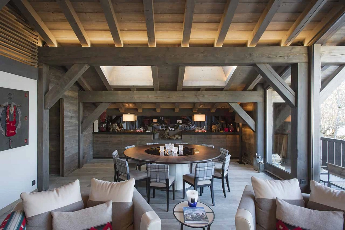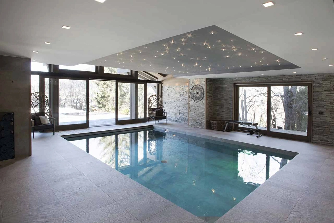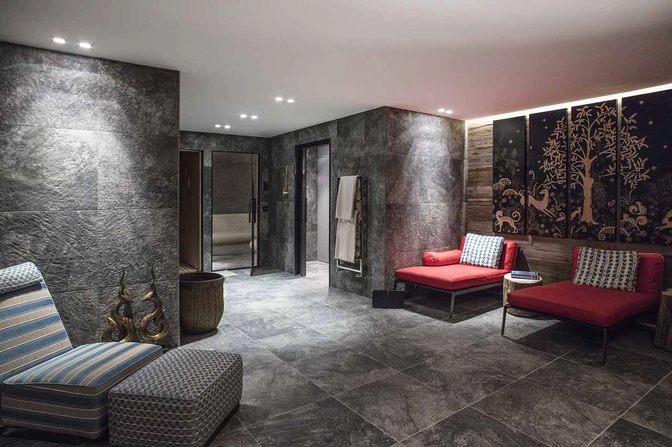 This 700m² chalet spans four floors connected by an elevator, seamlessly blending modern alpine style with authentic charm. Amenities include a large indoor pool with terrace access, a Jacuzzi, sauna, steam room, a fully-equipped fitness room, a dedicated massage room, a cinema room, and a games area with table football.