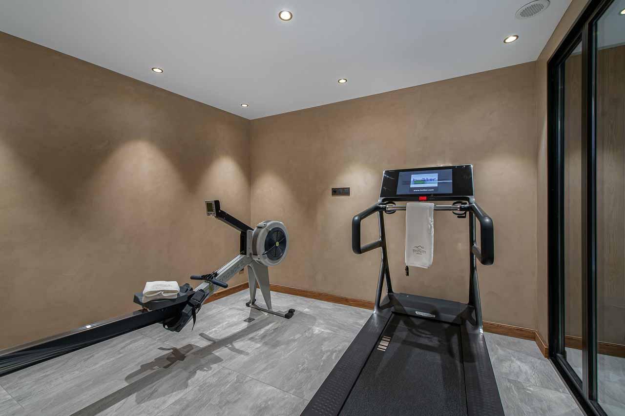 Beyond the main living area, the lower ground floor is entirely dedicated to wellbeing and entertainment. Here, you will find a spectacular wellness area featuring an indoor swimming pool, a soothing hammam, and an invigorating Italian shower. Energize in the modern fitness room before unwinding on the loungers or mixing a post-workout refreshment at the stylish bar. For cinematic evenings, the cozy mezzanine-level TV room provides the perfect hangout for all ages.
