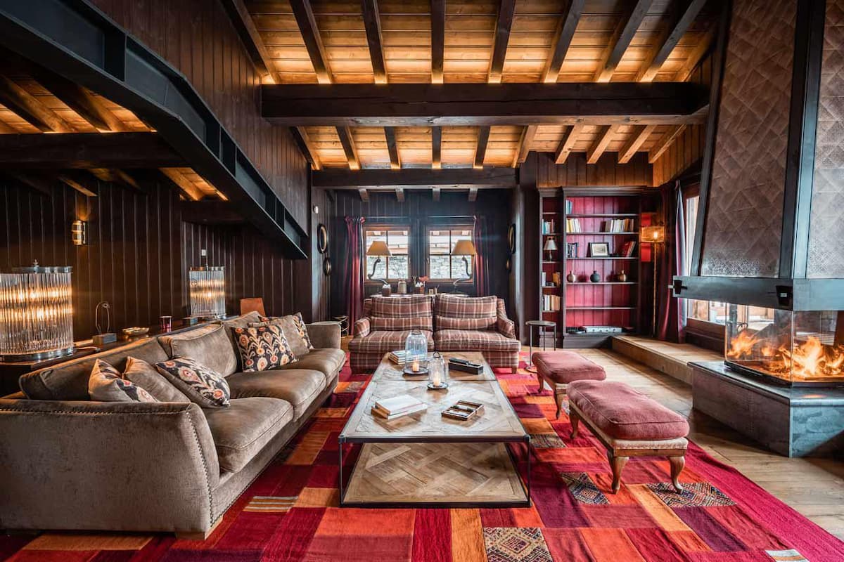 Crafted from recycled wood, the living spaces of the chalet boast impressive features, including vibrant furnishings, ambient lighting, and lofty vaulted ceilings. A central fireplace adds warmth to one wall, while the open-plan kitchen with a breakfast bar sits opposite the expansive living area. Between them, a cozy lounge and dining space beckon with plush seating arrangements.