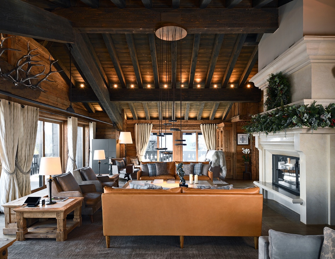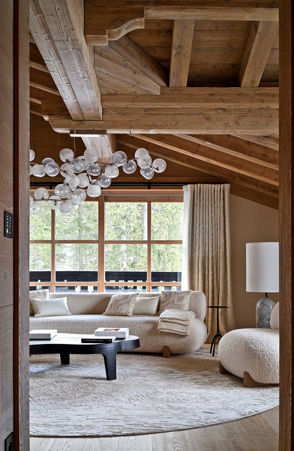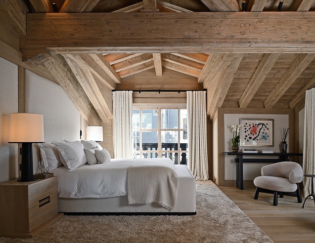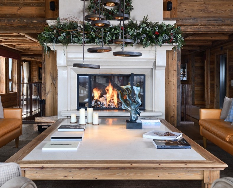 The third floor unveils an awe-inspiring, triple-aspect living and dining pavilion. Panoramic windows and a wrap-around balcony frame uninterrupted mountain vistas, bathing the space in natural light. Twin reception areas, anchored by a welcoming fireplace with sumptuous seating, flow effortlessly into a formal dining room where a bespoke table hosts up to 24. This is altitude of alpine living, designed for grand entertaining and intimate moments alike.