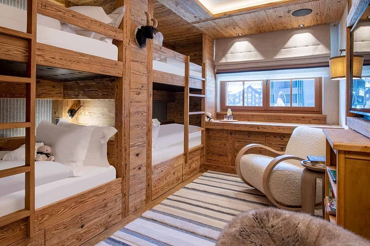 On the second level, the chalet boasts two luxurious master suites, each adorned with plush double beds and commanding breathtaking mountain vistas. Ascending to the first level, guests will discover an additional trio of bedrooms: two featuring twin setups and one spacious quad bunk room. Every bedroom is thoughtfully equipped with flat-screen TVs and seamlessly integrated sound systems.