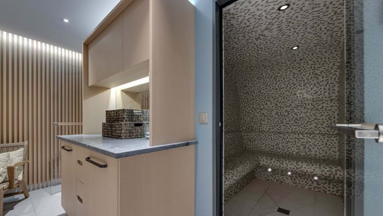 With a unique allure that draws clients back year after year, Val-487 also features two large, sheltered terraces offering breathtaking views of the resort and the Face de Bellevarde. A discreet outdoor hot tub is strategically placed for indulging in the scenic beauty with a glass of champagne in hand.