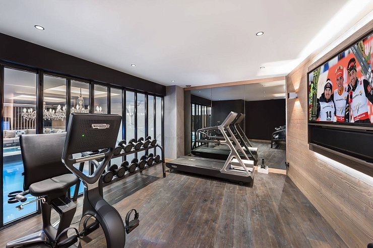 Descend to the lower level, where a world of rejuvenation awaits. Immerse yourself in the sublime wellness area featuring an indoor swimming pool, Jacuzzi, hammam, sauna, and a dedicated massage room. After a day on the slopes, unwind in the bar and relaxation area, creating the perfect ambiance for post-ski relaxation. For those seeking an adrenaline rush, a fully-equipped fitness room and home cinema offer the ideal combination of invigoration and entertainment.