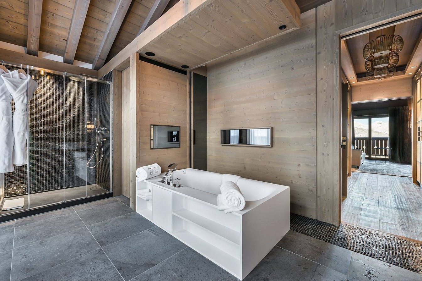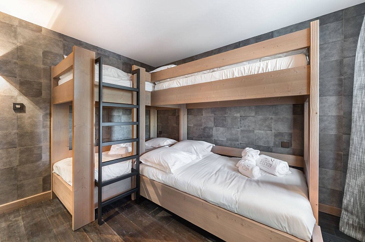 Across the first and ground level, The remaining four double/twin bedrooms are thoughtfully distributed, each boasting its own en-suite. Two of these bedrooms additionally offer dressing rooms for added convenience. Positioned on the first level, the children's bedroom is equipped with two sets of bunk beds, complemented by its own en-suite. Throughout, the bedrooms exude a stylish and modern ambiance, adorned with lavish furnishings, refined wooden interiors, and decor that beautifully captures the essence of the natural mountain environment surrounding the chalet.