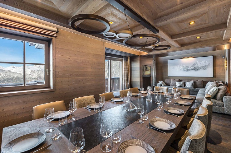 On the second level, the main living area invites you to unwind in front of a crackling fireplace or gather around the expansive dining table that seats 14. Floor-to-ceiling doors open onto a panoramic balcony, revealing breathtaking mountain views. A professionally equipped kitchen and a bar with stools set around a small table in the entrance hall complete the heart of this extraordinary chalet.