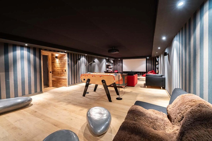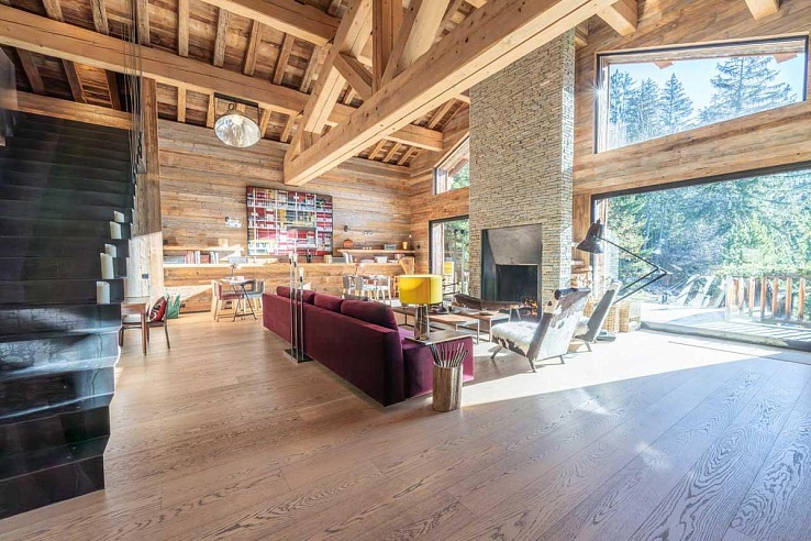 Externally, Chalet Le Grand Cerf boasts a traditional wooden appearance, but its interior reveals a sophisticated, contemporary design with high ceilings and modern comforts. The main living area on the third floor presents an industrial chic ambiance, featuring vibrant sofas, contemporary art pieces, a fireplace, and three gaming tables.