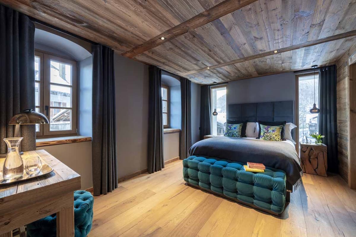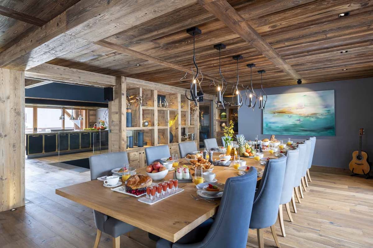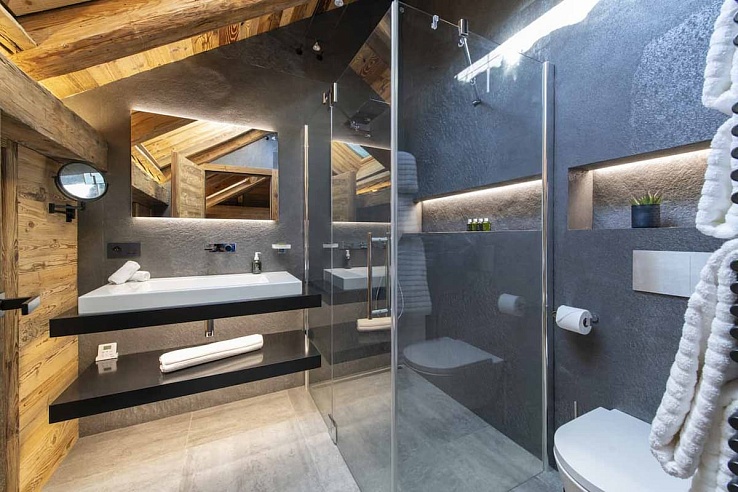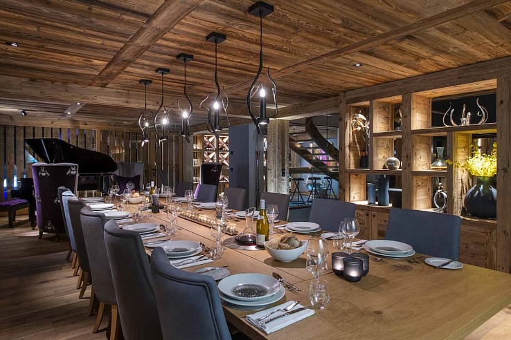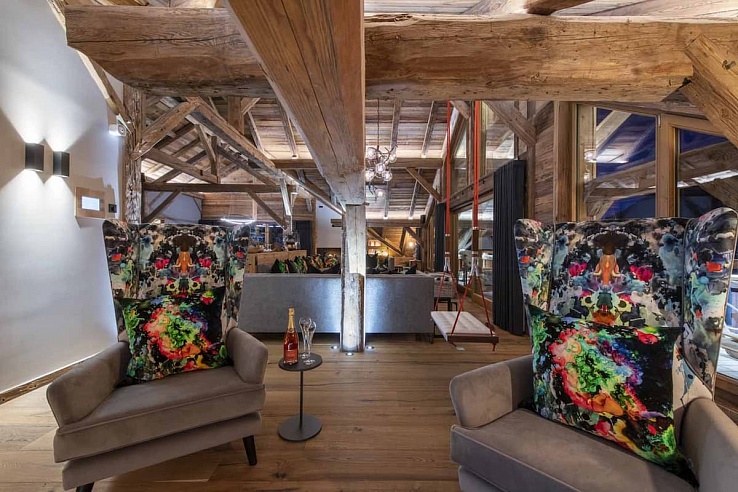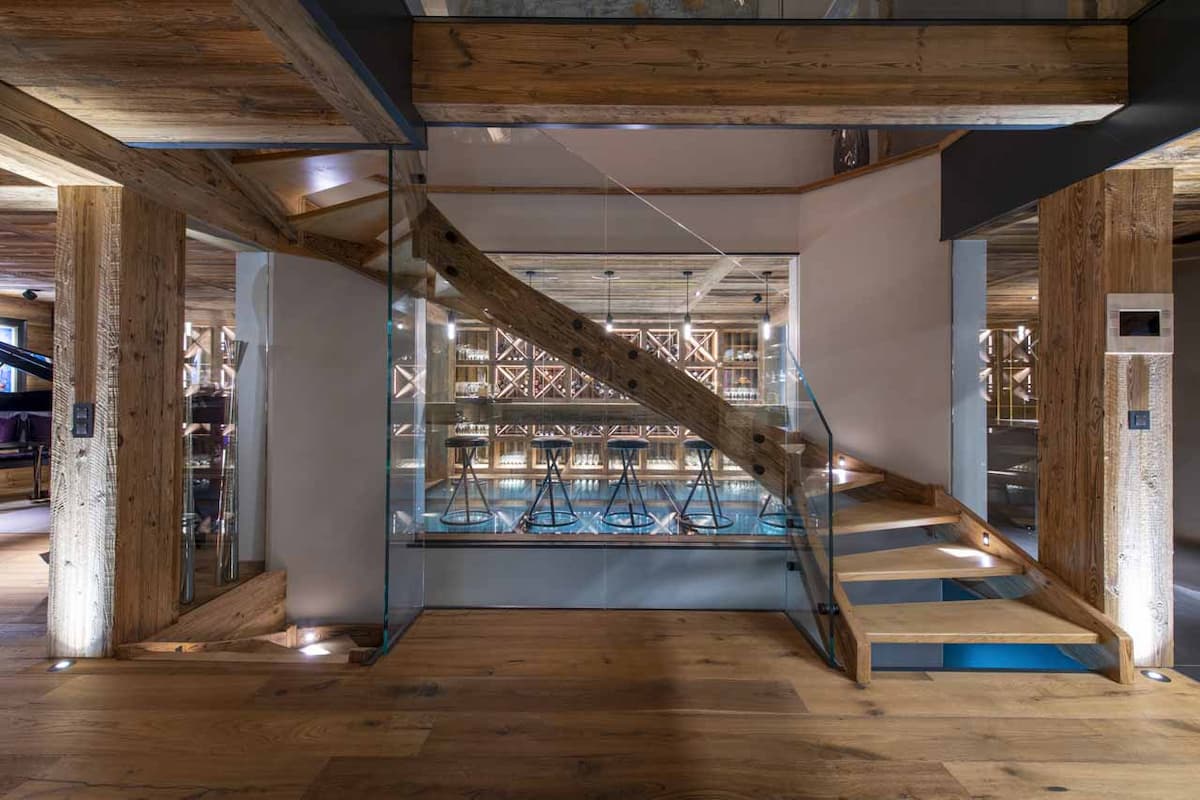 Grande Maison, situated in the heart of Montriond's village square, combines the historic Chalet La Maison with the adjacent Owner's Lodge. These properties are linked by underground parking. Dating back to 1749, La Maison has been meticulously renovated, preserving its original charm, including a staircase carved from Caithness stone, aged 370 million years and sourced from Scotland's Northern Highlands.