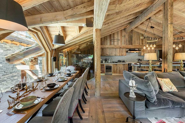 Nestled in Le Fornet, Val-214 is perfectly situated for avid skiers, just 200 meters from the ski slopes and the Fornet cable car. The chalet blends stone and high-quality wood in its design, featuring high ceilings and expansive bay windows that create a sense of openness and light. Spanning four floors, the chalet provides 412 m² of living space and can host up to eight adults and six children.