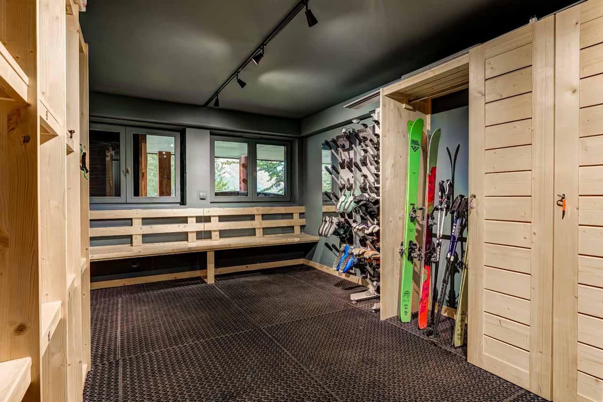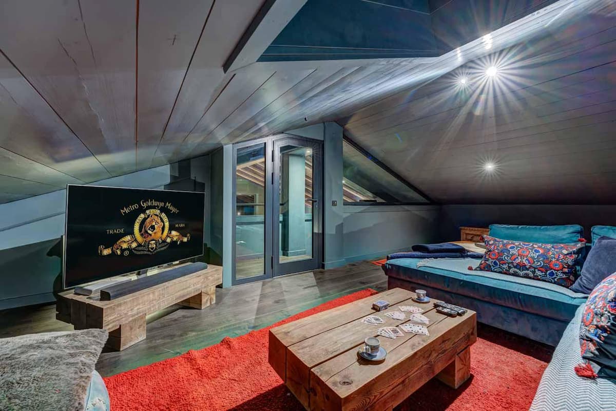 The lower floor of the chalet, which extends into the garden during the summer months, offers a wonderful indoor relaxation space complete with a swim spa featuring jet streams and massage jets, comfortable sofas, and a sauna. Additional facilities include a ski room with boot warmers and a garage.