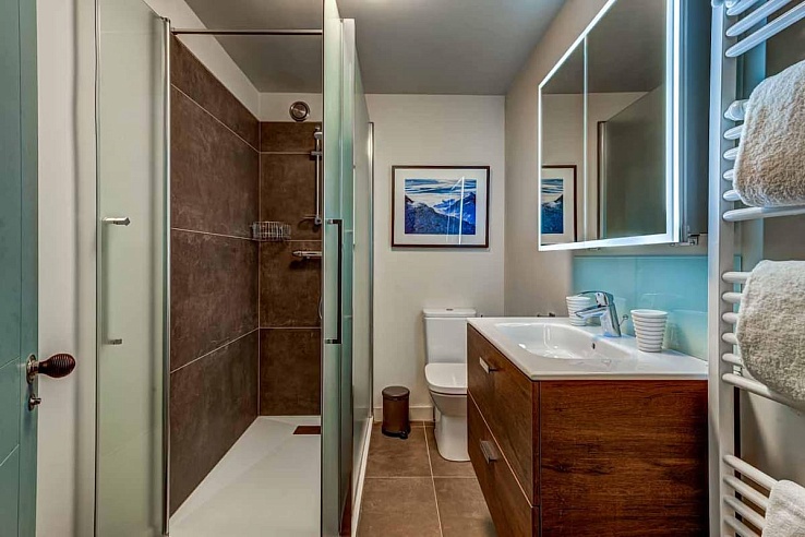 The main highlight is the expansive open-plan living area, featuring a stylish sofa zone with a fireplace, leading into a delightful dining space and a well-appointed modern kitchen with a breakfast bar. Enjoy spectacular views from the large sun terrace overlooking the Mont Blanc panorama and the Alpine meadows below, perfect for sledging adventures.