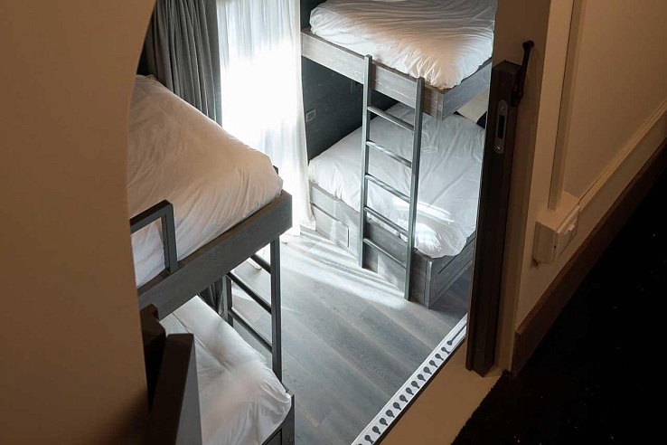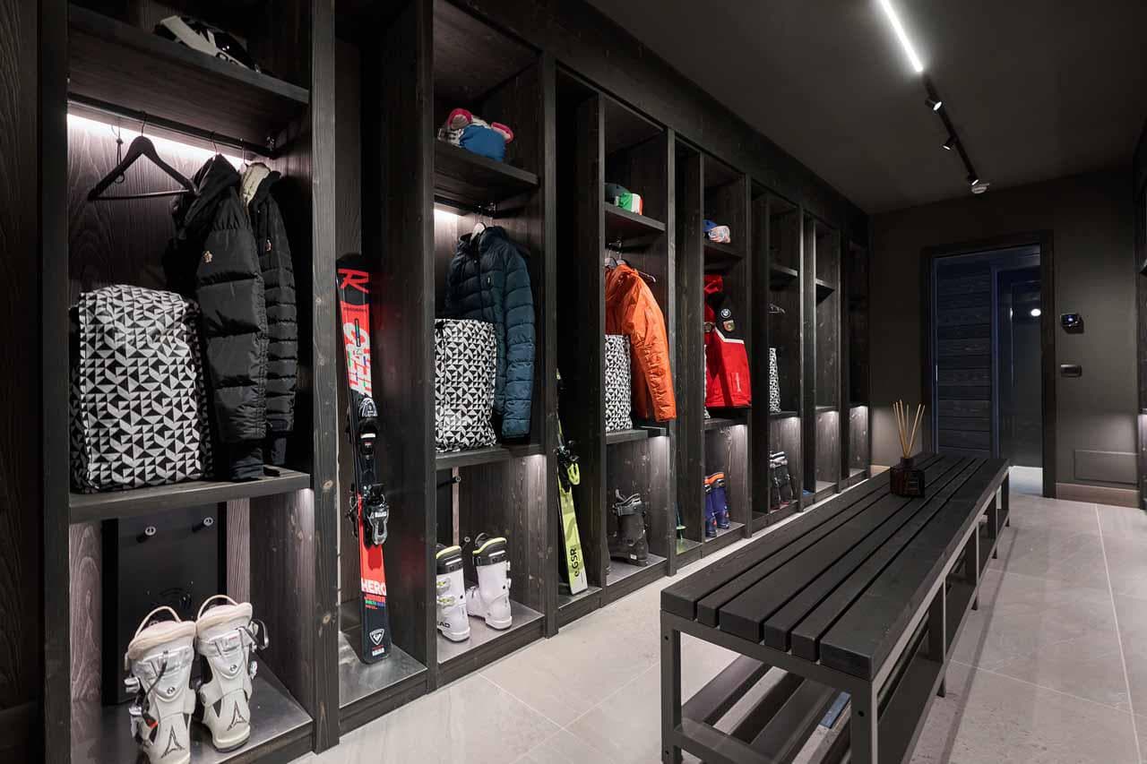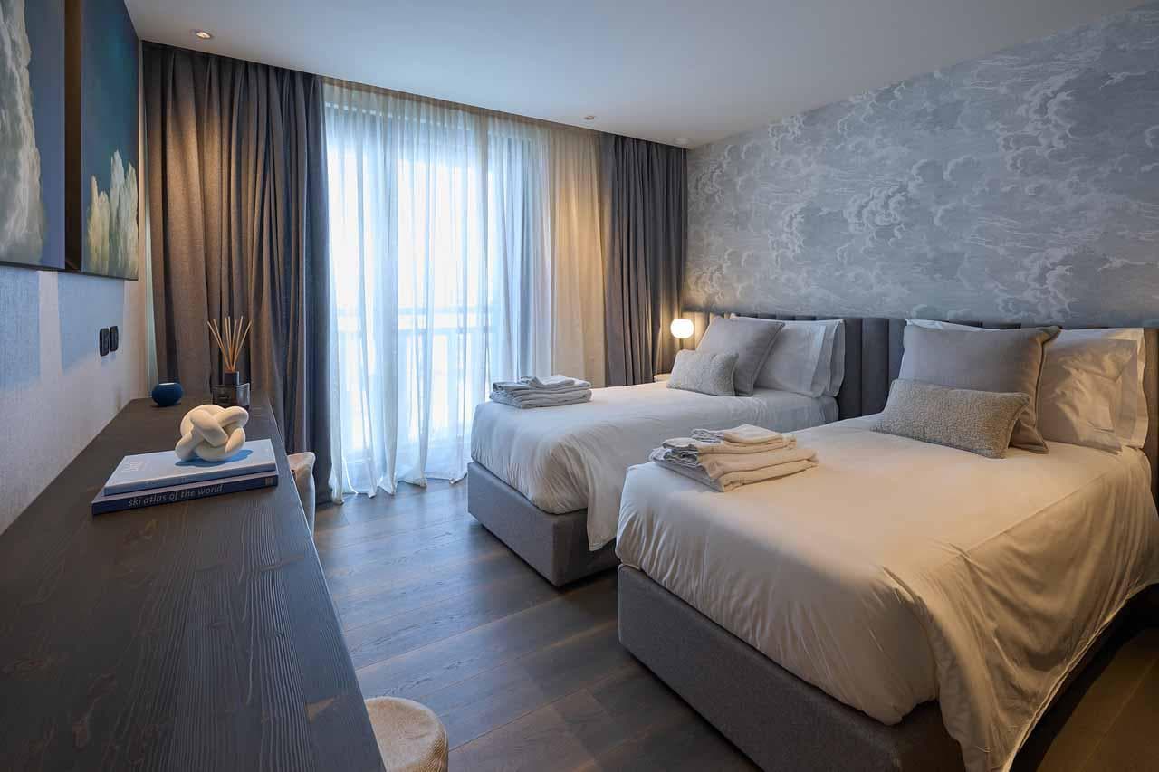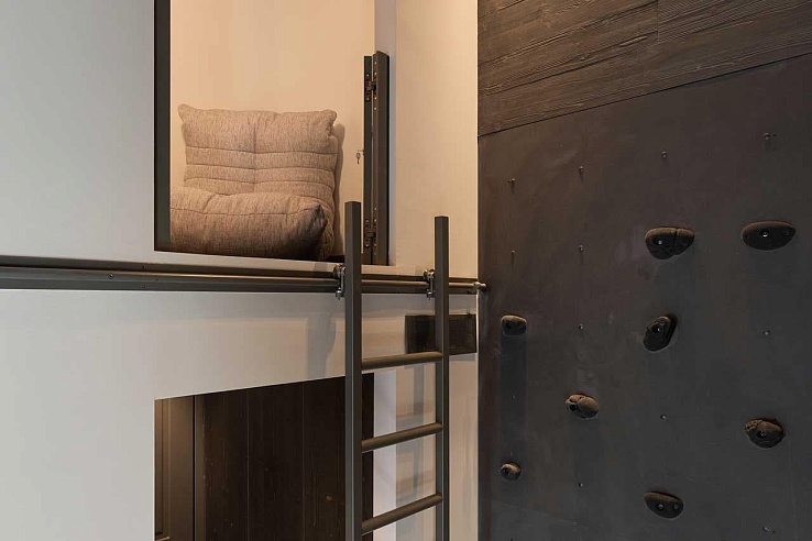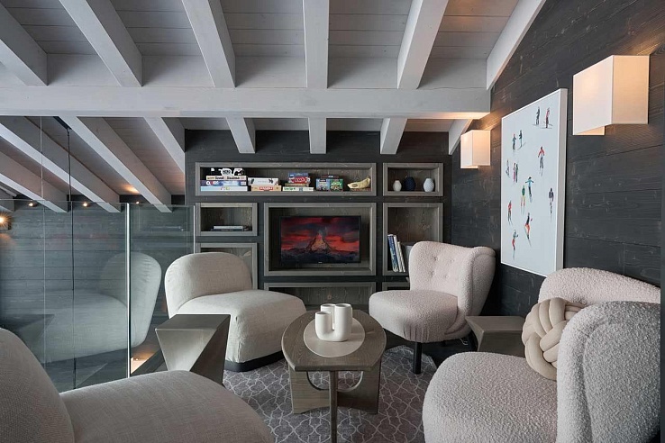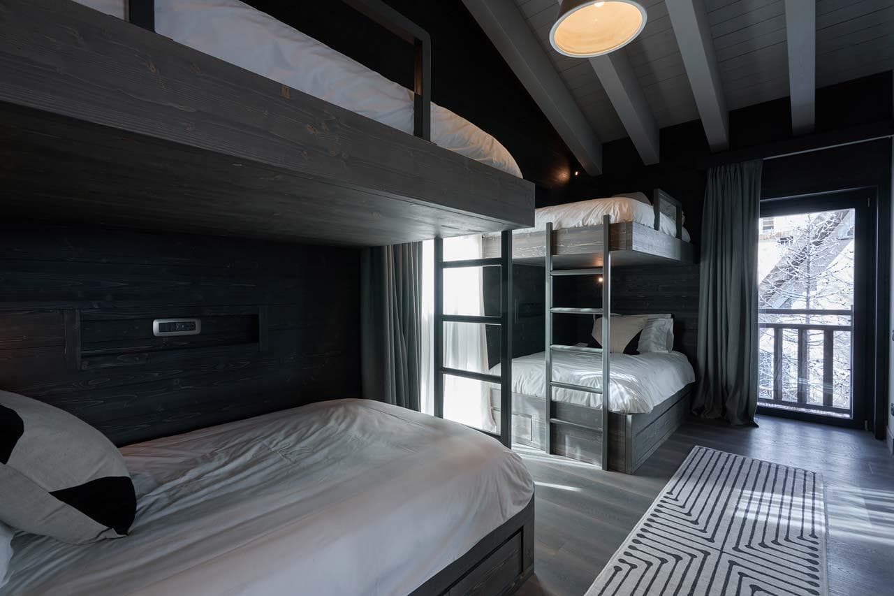 The upper floors feature six meticulously designed en-suite bedrooms, each blending luxury, functionality, and playful charm. Among these, three fixed double bedrooms cater to comfort and elegance: the first is a super king bedroom enhanced with a walk-in wardrobe, a private balcony offering breathtaking views of the Matterhorn, and refined interiors; the second boasts an equally spacious super king bed, while the third provides a luxurious king-sized double. For added flexibility, two twin/double bedrooms are equipped to convert seamlessly into double configurations, adapting to guests’ needs. The sixth bedroom is a playful haven with two sets of queen-size bunk beds (sleeping four), a climbing wall, and a ladder leading to a secret den in the eaves, lockable on request. Every bedroom is outfitted with modern amenities, including Apple Home Pod minis and individual thermostats, ensuring personalized comfort. The bespoke bathrooms further elevate the experience, crafted with premium Italian materials to embody sophistication and timeless style.