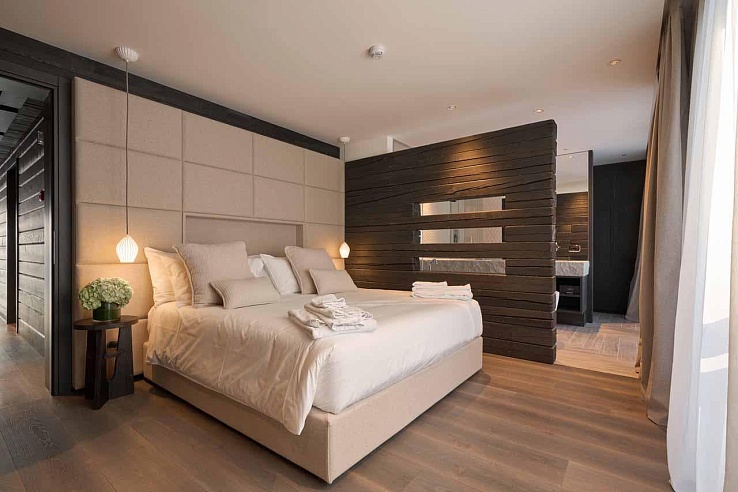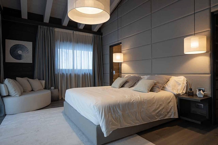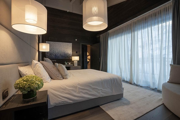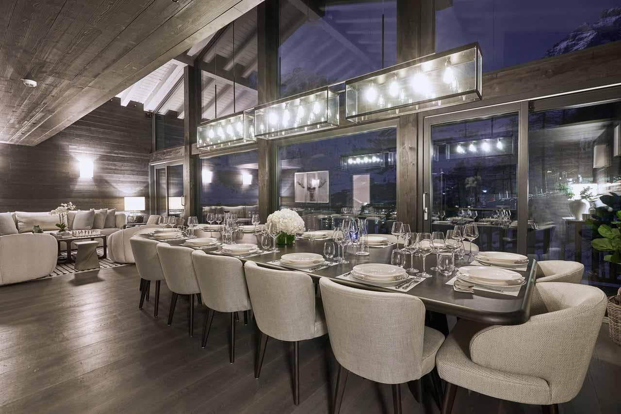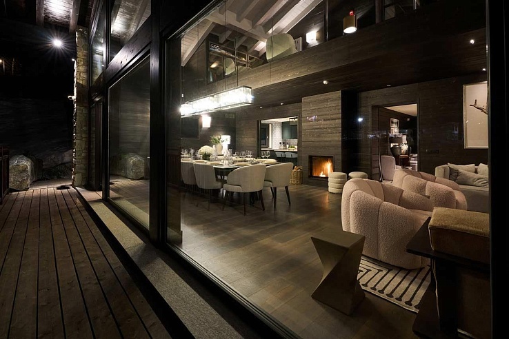 Designed to frame the iconic Matterhorn, the chalet’s open-plan living area features double-height ceilings and floor-to-ceiling windows, immersing guests in panoramic mountain vistas. Relax by the fireplace on plush sofas, dine at the artisan wooden table for 14, or step onto the balcony to savor crisp alpine air. A state-of-the-art kitchen and dedicated chef (available on request) cater to gourmet meals, while ambient lighting enhances evenings spent in this sleek, airy space.