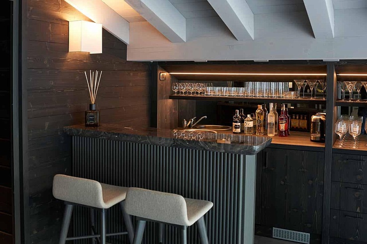 Beyond the living area, a hidden door reveals a vibrant games and cinema room with pool, table tennis, table football, and a bar for après-ski cocktails. Movie nights unfold on a sumptuous extendable sofa, complete with popcorn and sweets.