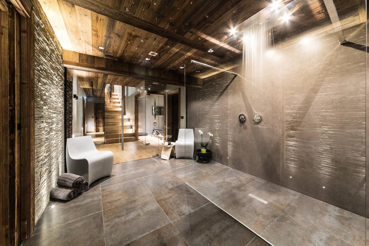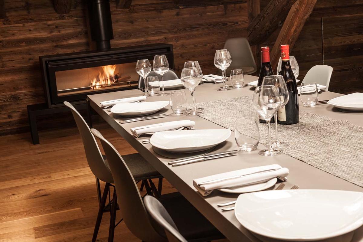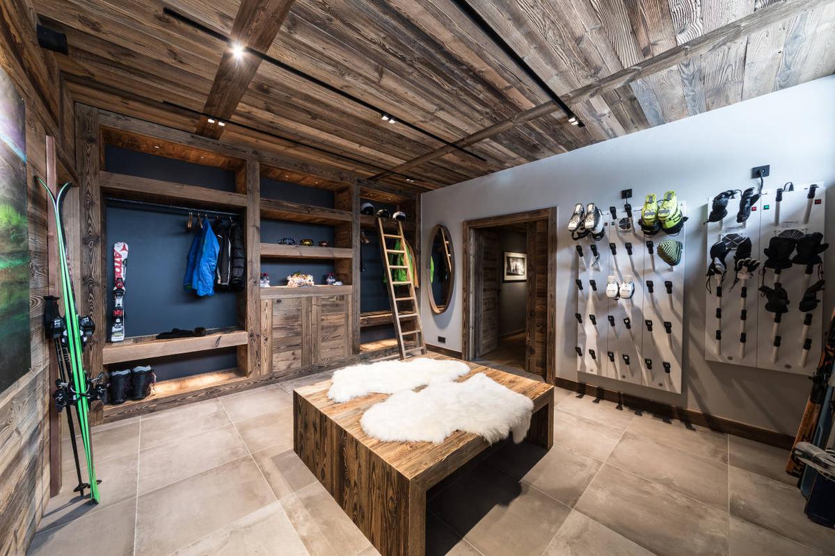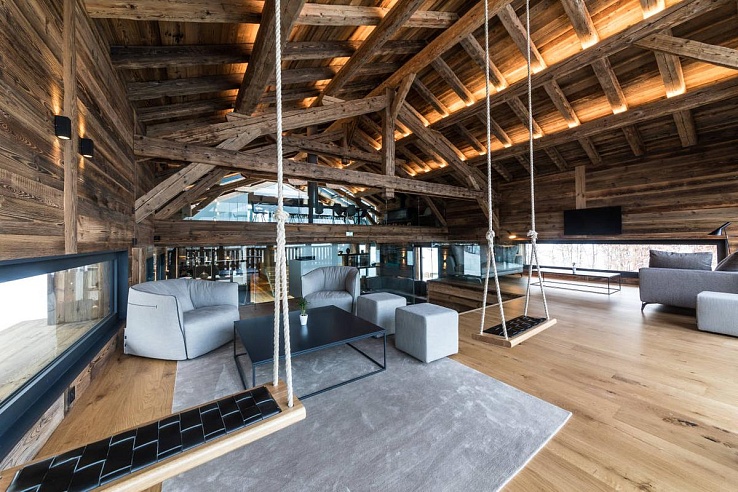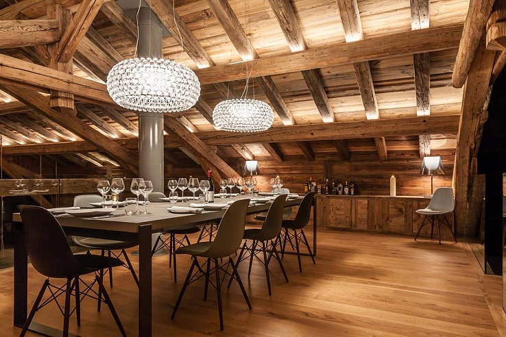 The centerpiece of the chalet is its expansive living area, complete with a central fireplace surrounded by sofas. A floating mezzanine dining area overlooks the mountains while floor-to-ceiling windows in the bar area offer panoramic views of the valley. Private terraces are accessible from the lounge, library, and snug areas.
