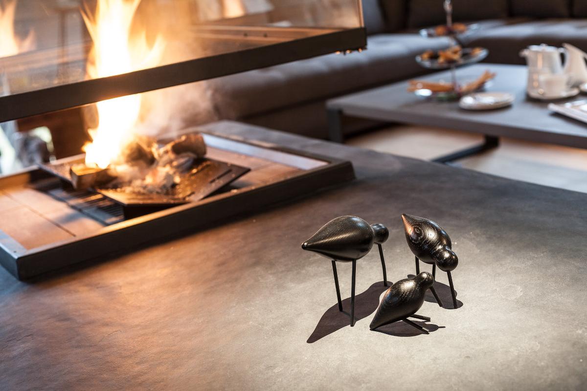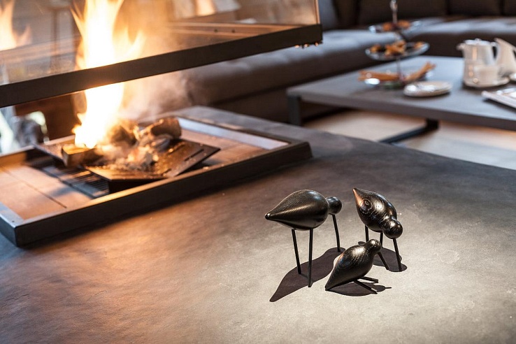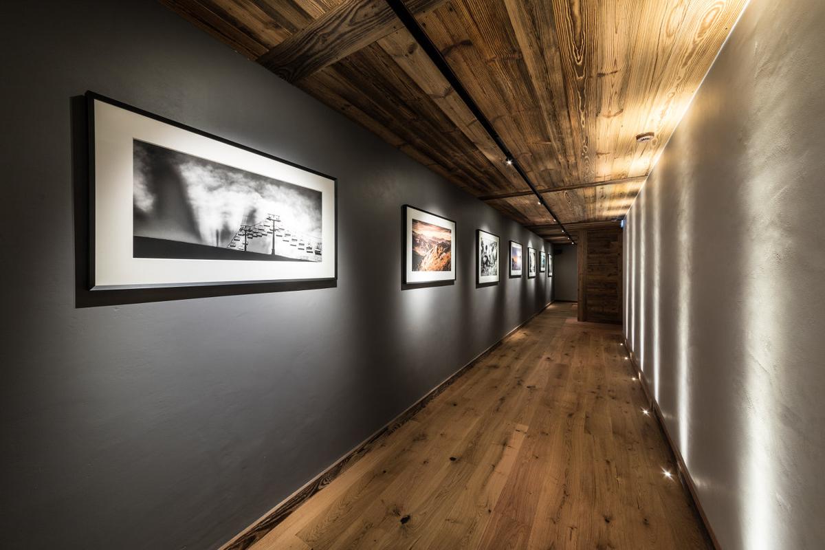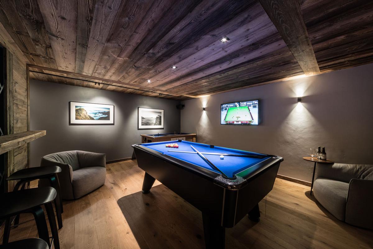 The centerpiece of the chalet is its expansive living area, complete with a central fireplace surrounded by sofas. A floating mezzanine dining area overlooks the mountains while floor-to-ceiling windows in the bar area offer panoramic views of the valley. Private terraces are accessible from the lounge, library, and snug areas.