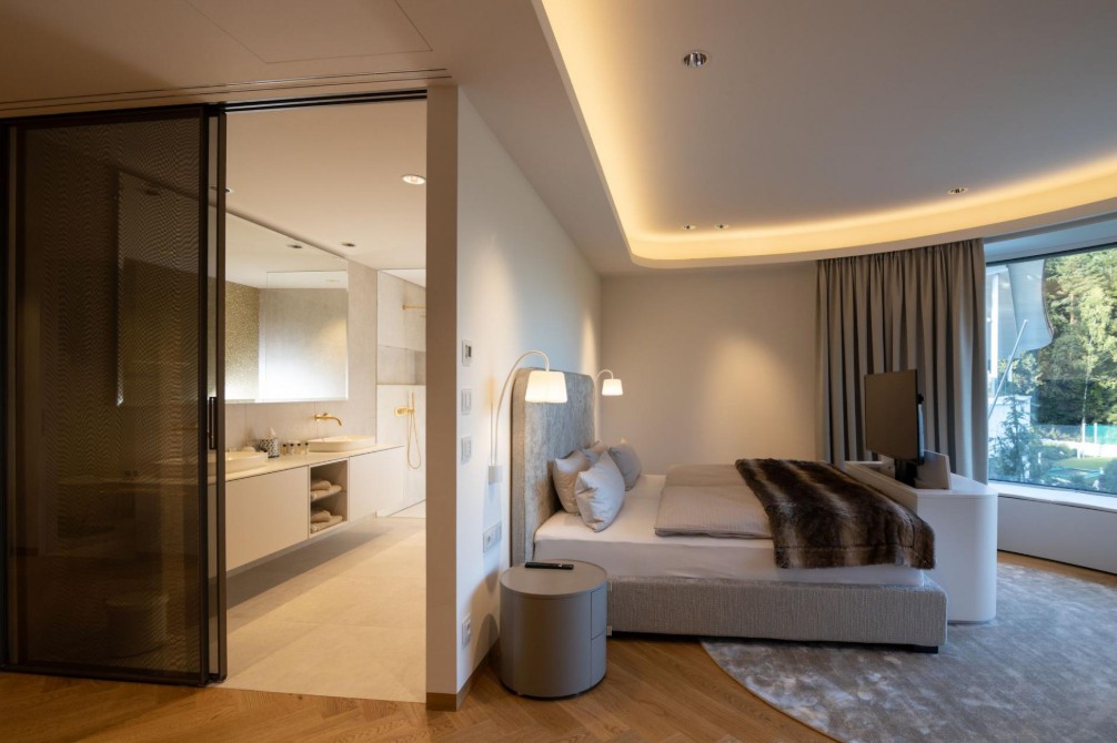 Each of the 10 bedrooms harmonizes with the natural surroundings, adorned in soft tones, luxurious fabrics, and original artwork. Eight en-suite doubles feature Austrian twin/double beds (convertible on request) with retractable TVs, Sonos sound systems, blackout curtains, and soundproofing. The family suite shares a bathroom between two rooms. Opulent touches like gold accents and height-adjustable beds elevate comfort, while 10 underground parking spaces and an elevator ensure seamless access.