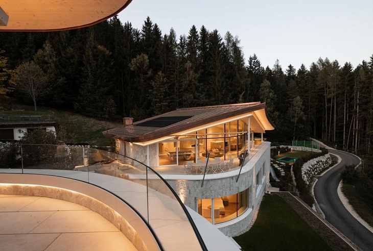 Designed with minimalist sophistication, Kitz416captivates with floor-to-ceiling glass facades framing the idyllic Alpine landscape. The main building’s centerpiece is a revolving circular sofa, allowing guests to alternate between mesmerizing valley views and the warmth of a grand fireplace, accompanied by melodies from a self-playing Yamaha piano. Both buildings feature 10-seat dining areas, ideal for savoring gourmet meals while immersed in the scenery. Expansive terraces and balconies invite alfresco relaxation, complete with firepit lounges and dining spaces.
