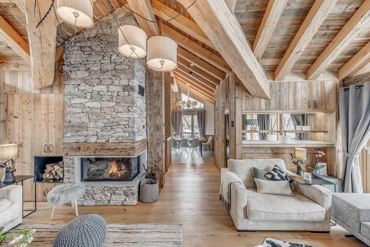 The chalet's interiors, crafted from stone and wood, exude a classic alpine charm. The open-plan living area offers a relaxed and inviting atmosphere, complete with a cozy fireplace. Guests can lounge on plush sofas, gather at the sophisticated dining table, or step onto the balcony to admire stunning views of the snowy mountains.