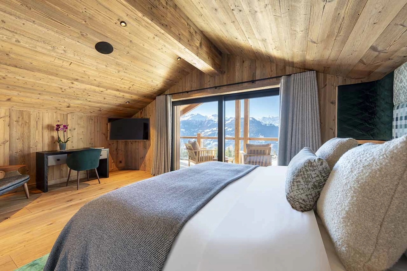 The sleeping quarters are a masterclass in flexible luxury. Occupying the entire top floor, the master suite is a private sanctuary featuring a super-king bed, a dressing room, a private balcony, and a spacious en-suite bathroom. The remaining four bedrooms offer king/twin flexibility, each with its own en-suite bathroom or shower room; most boast direct access to terraces, blending indoor comfort with the alpine atmosphere. This configuration, with all rooms en-suite, makes the chalet ideal for discerning groups of friends or multi-generational families.