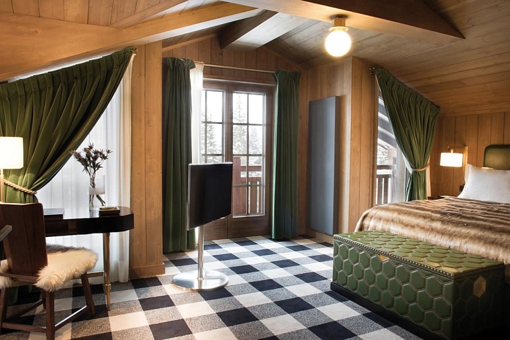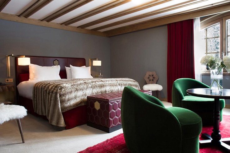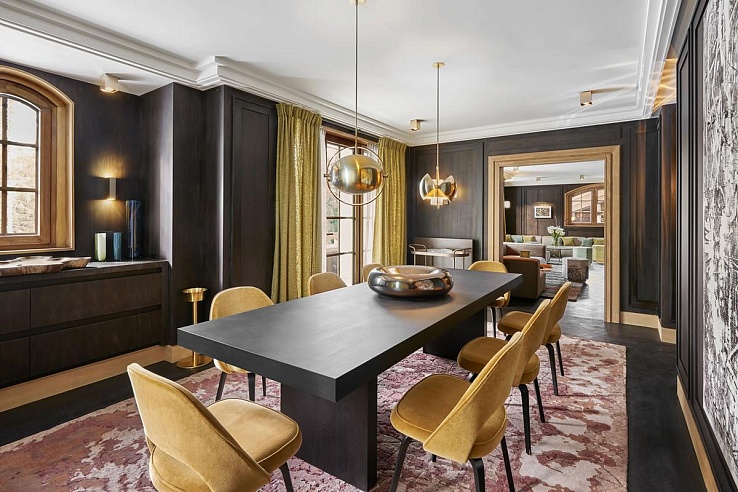 Designed by acclaimed Parisian designers India Mahdavi and Joseph Dirand, the chalet blends contemporary elegance with its Alpine surroundings. Rich burgundy, green, and wood tones create a warm atmosphere, complemented by soft furs, cashmere, and wool plaid for added coziness. Guests enter the chalet through a private ground-floor entrance, leading to a lobby with lift access. The ground floor features a kitchen, dining room, lounge with a bar, TV area, and fireplace.