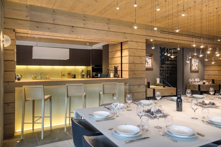 Meri483 is designed for diverse entertainment and relaxation. A dedicated home cinema provides a perfect setting for movie nights, while the lower-level wellness and games area, complete with a bar, invites post-ski socializing. The southwest-facing terrace is an ideal spot for aprés-ski drinks while soaking in the magnificent mountain vistas.