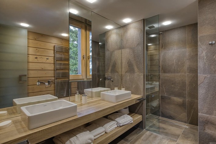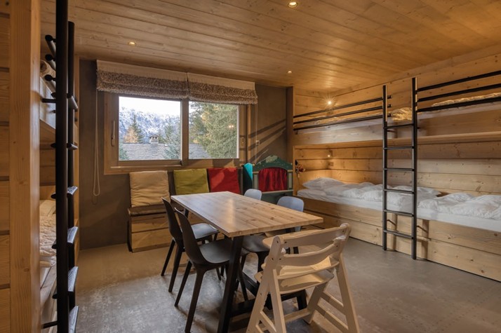 The chalet's bedrooms are thoughtfully arranged across the floors to ensure privacy and peace. The top floor is dedicated to a spacious master suite, complete with a large bathroom, an office area, and a separate nook with beds for two children. Four further double en-suite bedrooms with king-size beds are located on the upper floor, one with an additional single bed. For younger guests, a charming dormitory on the garden level features three bunk beds and a dedicated bathroom.