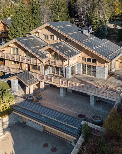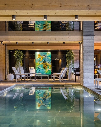 Perfectly positioned for ski-in/ski-out access, this multi-level chalet accommodates 10+6 guests in sublime comfort. The heart of the home is a majestic, double-height lounge, centered around a striking glass fireplace and framed by large bay windows that open onto balconies with panoramic mountain views. The adjoining dining area and fully-equipped kitchen, often served by a private chef, set the stage for gourmet gatherings. Beyond the main living spaces, an exceptional wellness area with a heated indoor pool, hammam, and massage room offers a serene retreat.