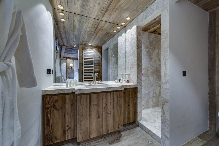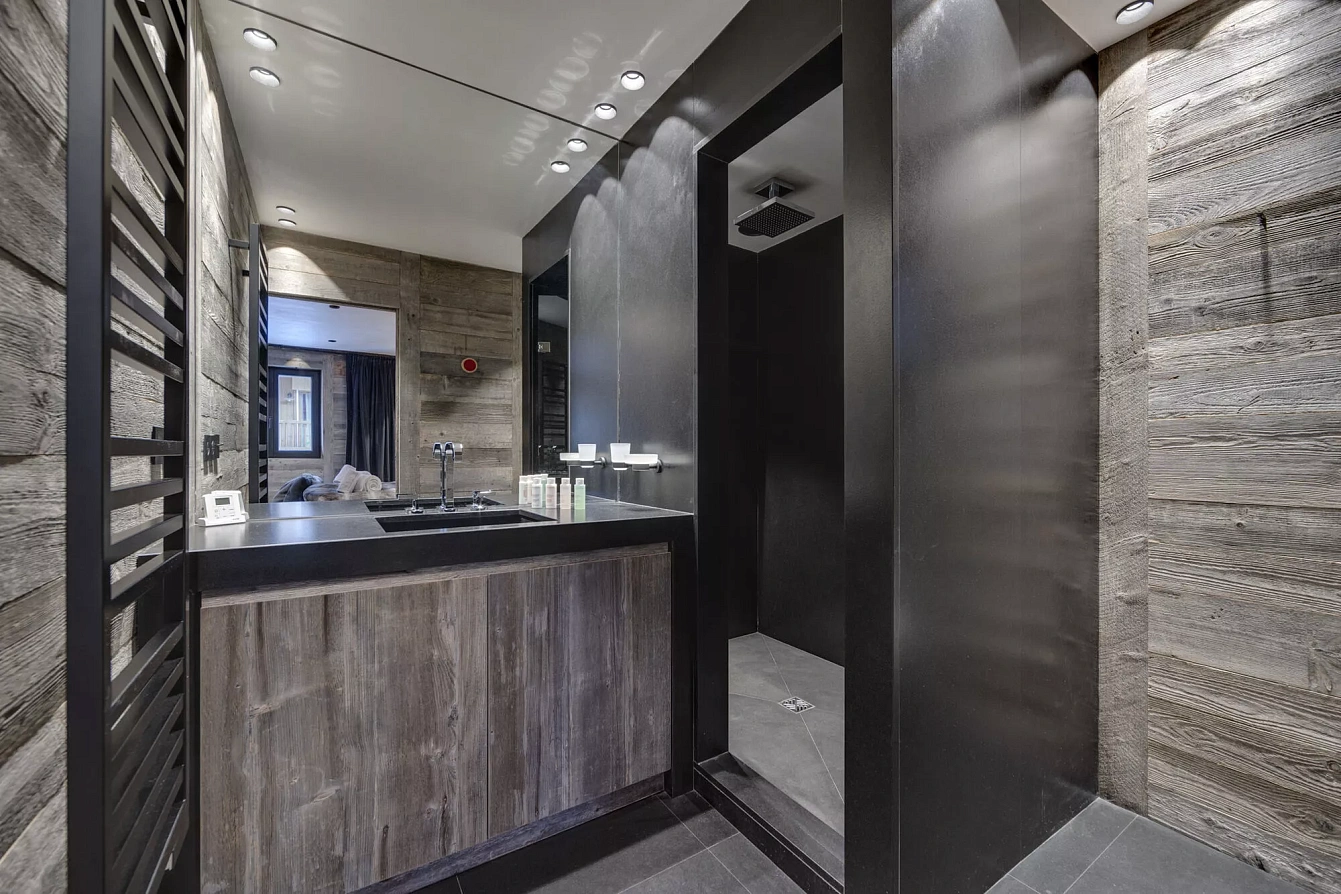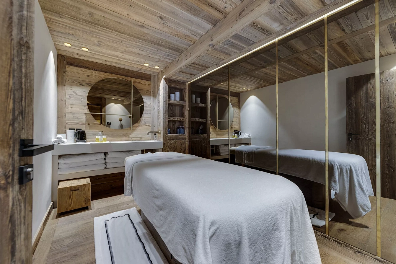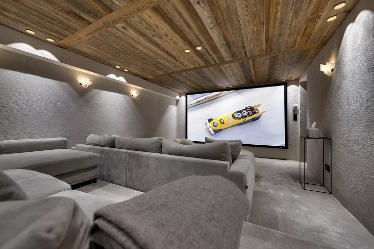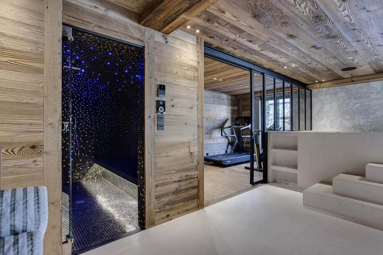 Beyond the main living area, the chalet unveils its true gems. The lower-level leisure area is a destination in itself, designed for ultimate relaxation and entertainment. Unwind in the steamy embrace of the hammam, take a refreshing dip in the indoor pool, or sink into the bubbling indoor Jacuzzi. For cinematic nights, the private home cinema room offers a sublime escape, while the dedicated massage room promises bespoke rejuvenation after a day on the mountain.