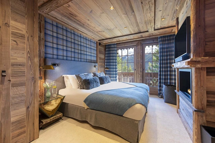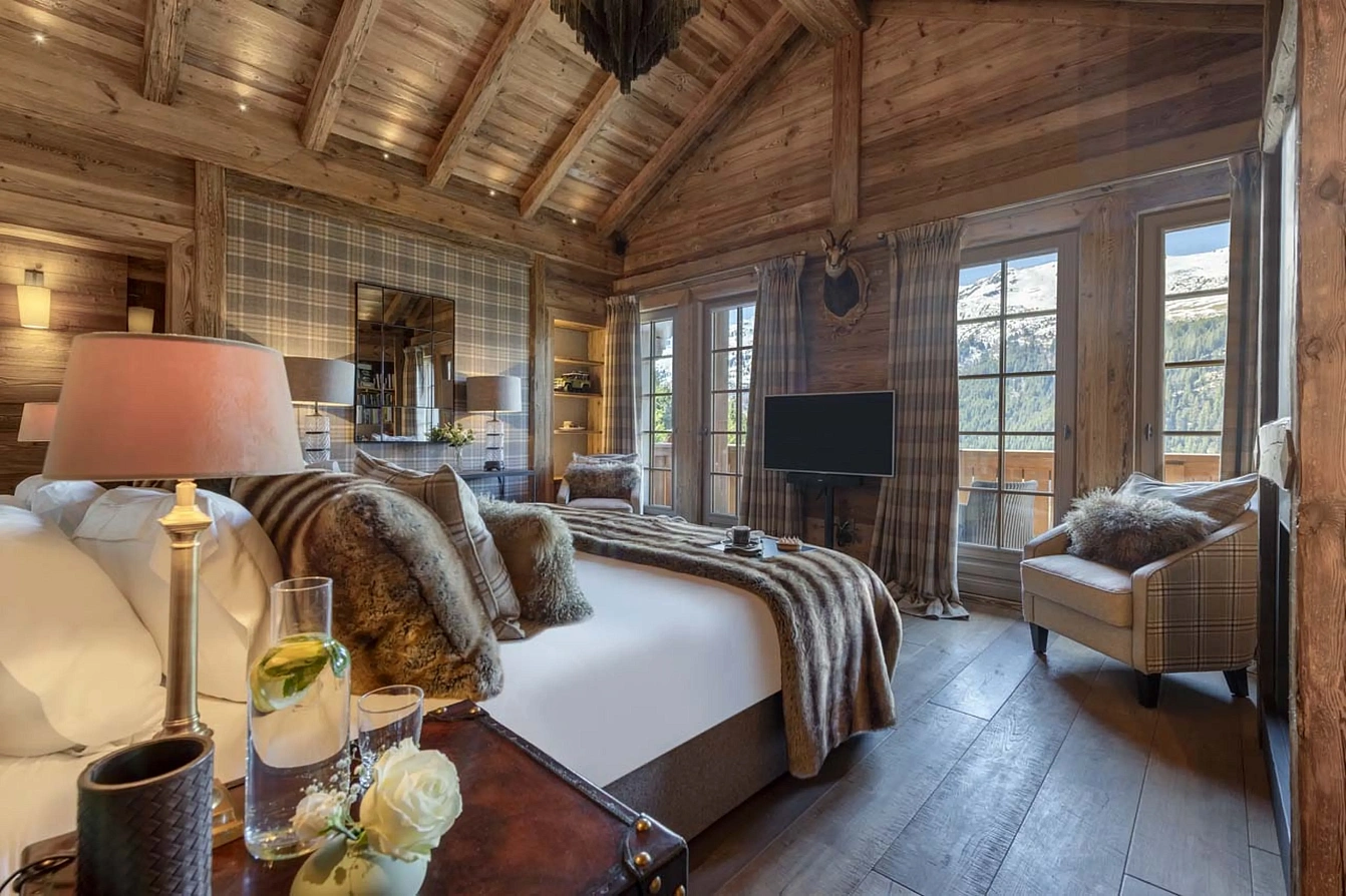 The entire top floor is a serene master sanctuary, complete with a private office featuring a fireplace, a wraparound balcony drinking in the alpine panorama, a generous dressing room, and a lavish en-suite bathroom with a deep soaking tub and a separate rain shower. The remaining five bedrooms are discreetly located on the ground floor, each a tranquil cocoon of soft natural tones and luxurious linens. Among them, three double bedrooms and one twin/double room feature en-suite bathrooms or shower rooms, terrace access, and several include their own romantic fireplaces. A dedicated bunk room, styled as a whimsical hideaway with twin beds, provides a perfect retreat for younger guests.