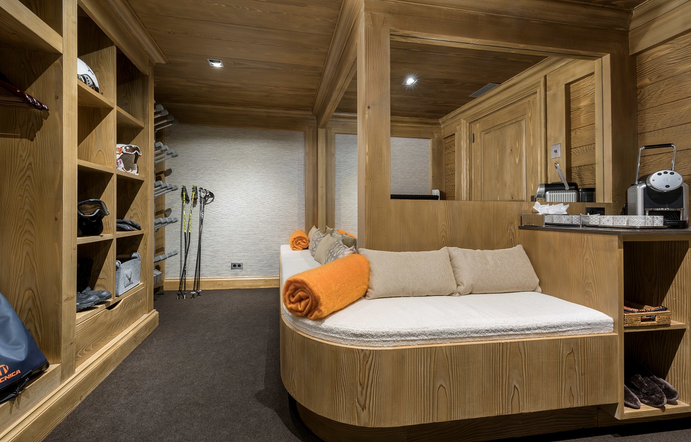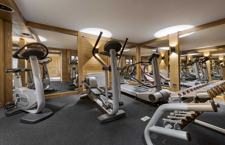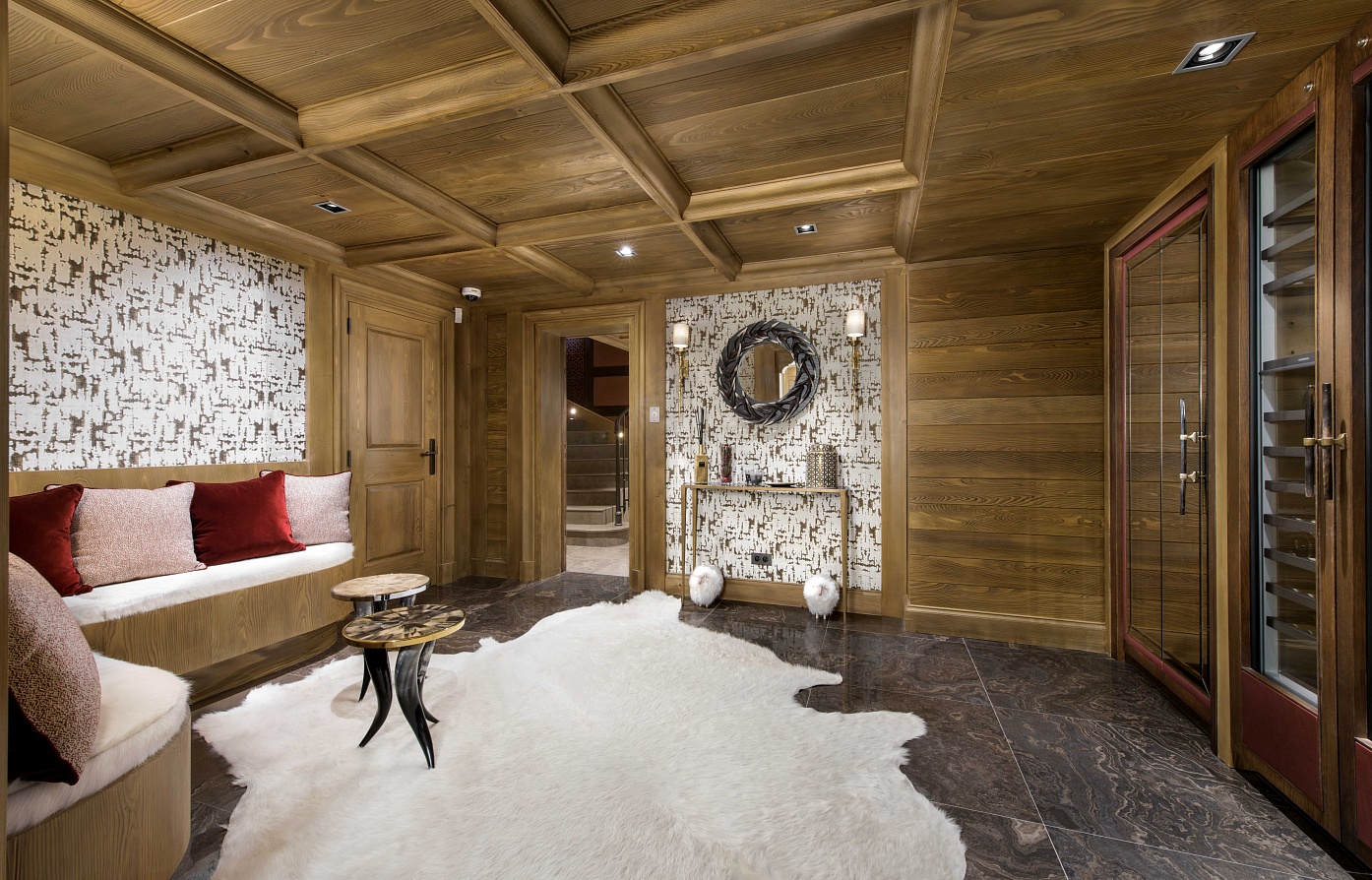 Spa area, a testament to sophistication, boasts grey stone and white-washed walls, complemented by subtle lighting, creating an atmosphere of relaxation. The 9 x 4-metre pool, accompanied by a sunken Jacuzzi on a black podium, invites indulgence. A comfortable seating area adjacent to the pool provides the perfect haven for unwinding after a day on the slopes. The wellness area extends its lavish offerings with a steam room, a private massage room for in-chalet treatments, and a well-appointed modern gym adorned with wall-size mirrors.