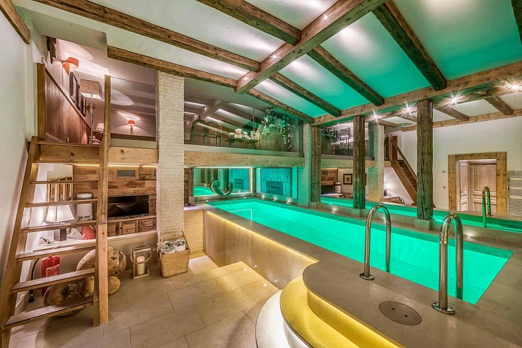 Take in the morning sun on the expansive south-facing terrace—a perfect setting for al fresco breakfasts or evening sundowners. The chalet boasts a remarkable spa area, featuring an indoor swimming pool equipped with a wave machine, jet stream, and mood lighting system. Indulge in the rejuvenating benefits of a hammam and sauna, or pamper yourself in the generously sized massage and spa treatment room. Post-relaxation, unwind at the poolside bar or visit the brand-new fitness area on the mezzanine level above the pool.