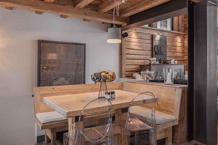 Val-355is ideally situated at the base of the Bellevarde slopes, just a short walk from the snow front and the town center. It blends traditional Savoyard design with modern architecture, offering spacious and elegant living areas in a stunning setting. The open-plan living and dining room is bright and airy, featuring comfortable sofas and leather armchairs around a stone fireplace and TV.
