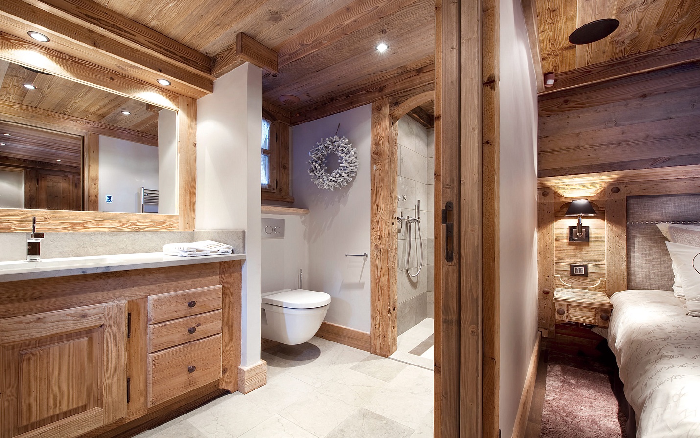 With seven en-suite bedrooms, including a spacious master bedroom with a private lounge and dressing room, Chalet Le Petit Chateau ensures supreme comfort for up to 14 guests. The master bedroom features a private terrace with breathtaking views of the surrounding mountains and Bellecote Piste. The entrance level houses a generous VIP suite, a second king-size bedroom, and two bunk bedrooms, all with en suite bathrooms.