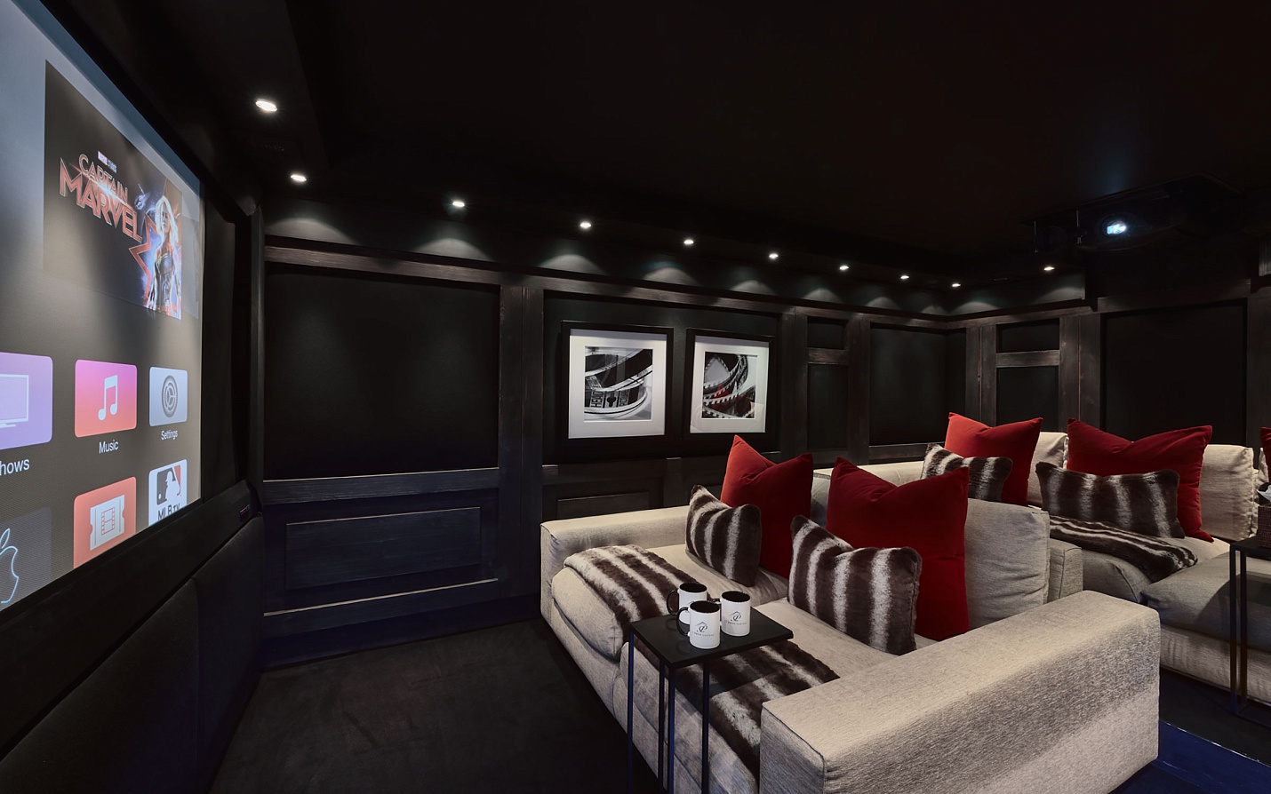 The ski-in/ski-out boot room provides a convenient space for ski preparation, complete with equipment lockers, boot warmers, and a welcoming drinks area. The lower ground floor offers a private bar, additional lounge space, and a dedicated cinema room with comfortable seating and a large screen for movie nights.