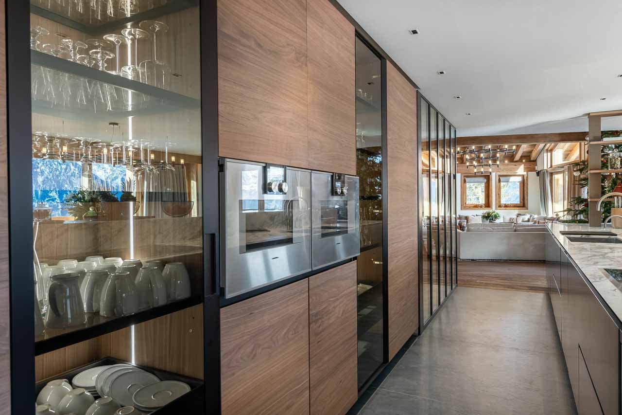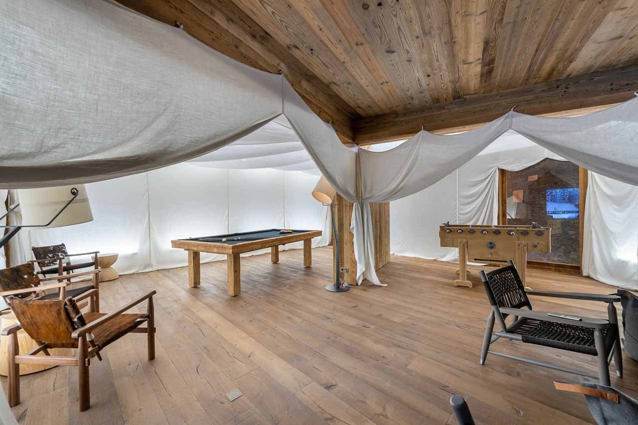 The chalet is equipped with an impressive array of facilities to entertain and refresh the guests. These include a games room with billiards, table football, and air hockey, as well as a cozy bar for after-dinner drinks. For relaxation, there’s a lavish spa featuring an indoor pool, Nordic bath, massage room, steam room, and sauna. Fitness enthusiasts will appreciate the small gym. Additionally, a second Nordic bath and barrel sauna can be found on the terrace, offering even more ways to unwind.