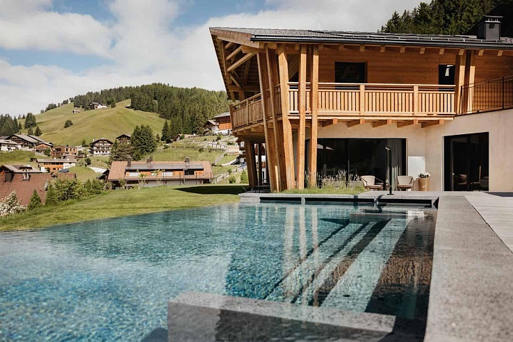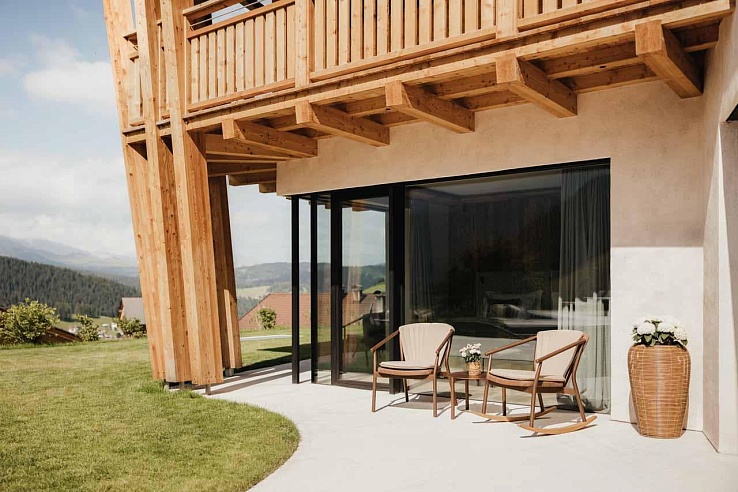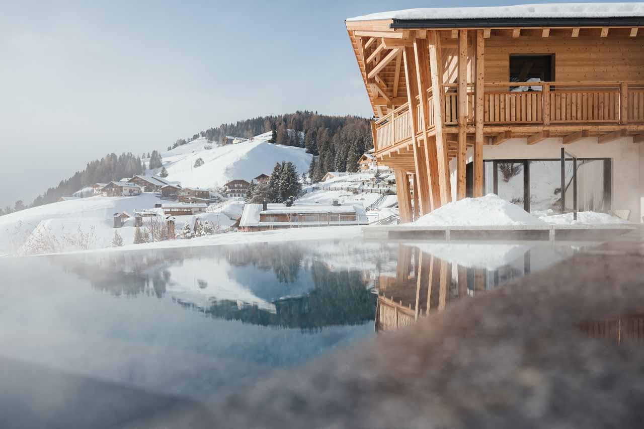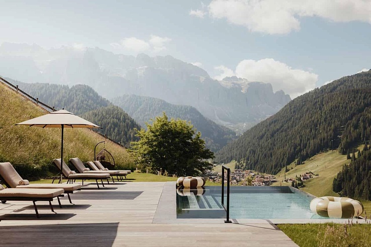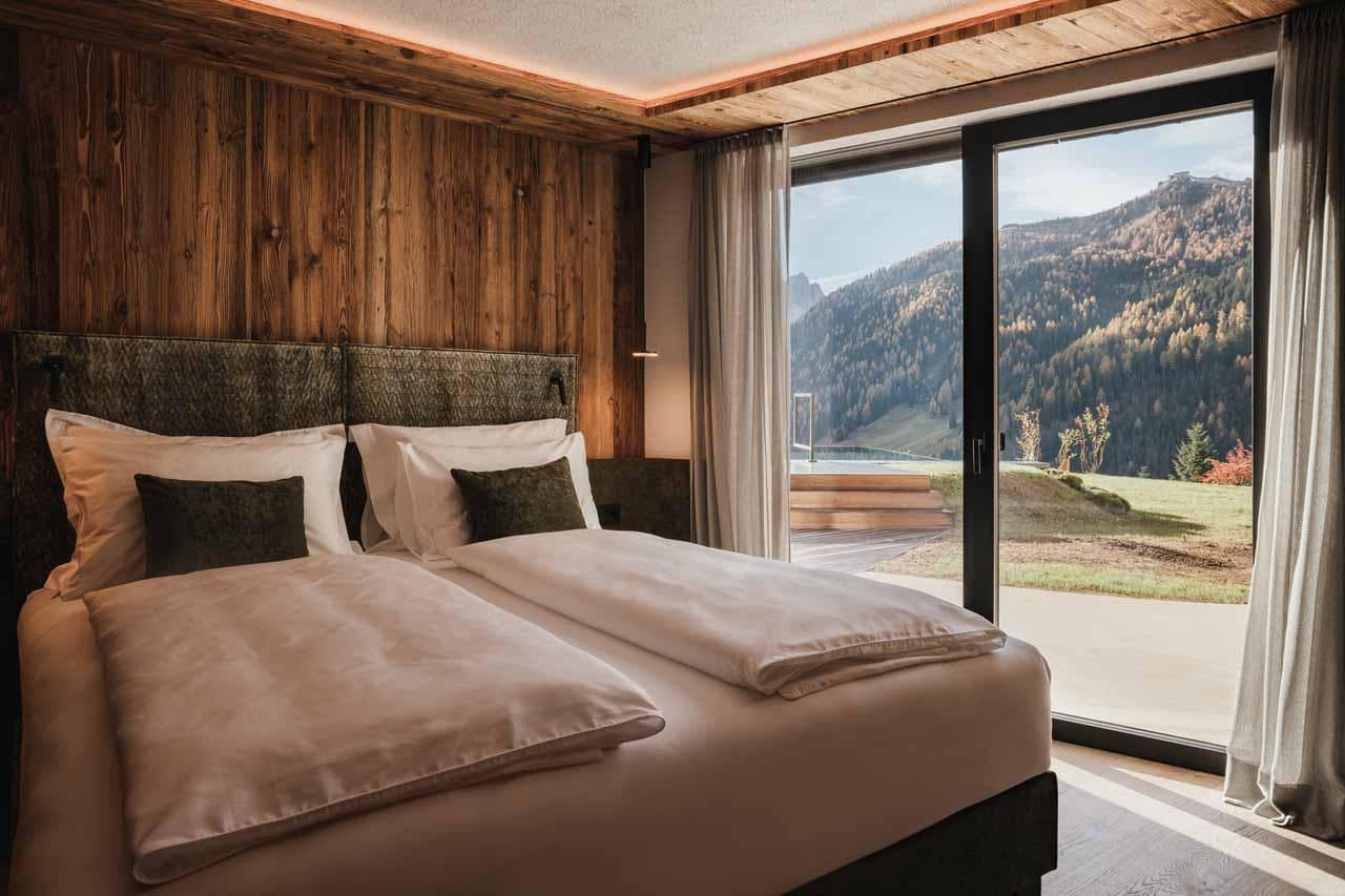 Nestled in the alpine village of Selva di Val Gardena, Lum d'Or Spa Chalet is an exclusive hideaway amid the UNESCO-listed Dolomites. This elegant chalet harmoniously blends into its dramatic mountain surroundings, offering a sanctuary of privacy, light, and panoramic vistas. Floor-to-ceiling windows frame views of Sassolungo, the Sella massif, and Sciliar, while warm wood accents and soft textiles create an ambiance of refined alpine comfort.