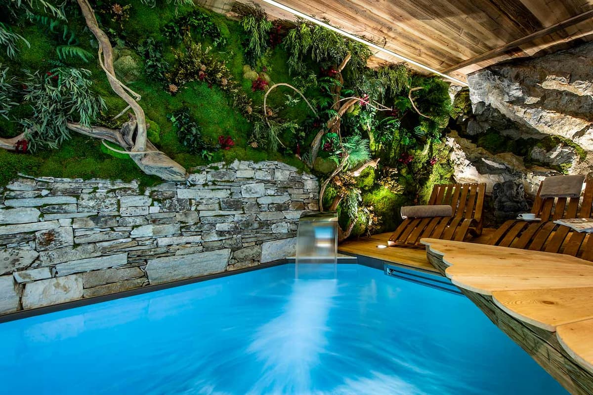 Upon entering the ground floor, the wellness area features an impressive indoor swimming pool with a counter-current system, a gym, a hammam, and a massage room. The second floor offers access to an outdoor hot tub, situated on an elevated plateau within the private garden. Additionally, there is a cinema room with lavish sofas for a relaxing movie night. The chalet includes a shared garage and a private ski room with ample storage.