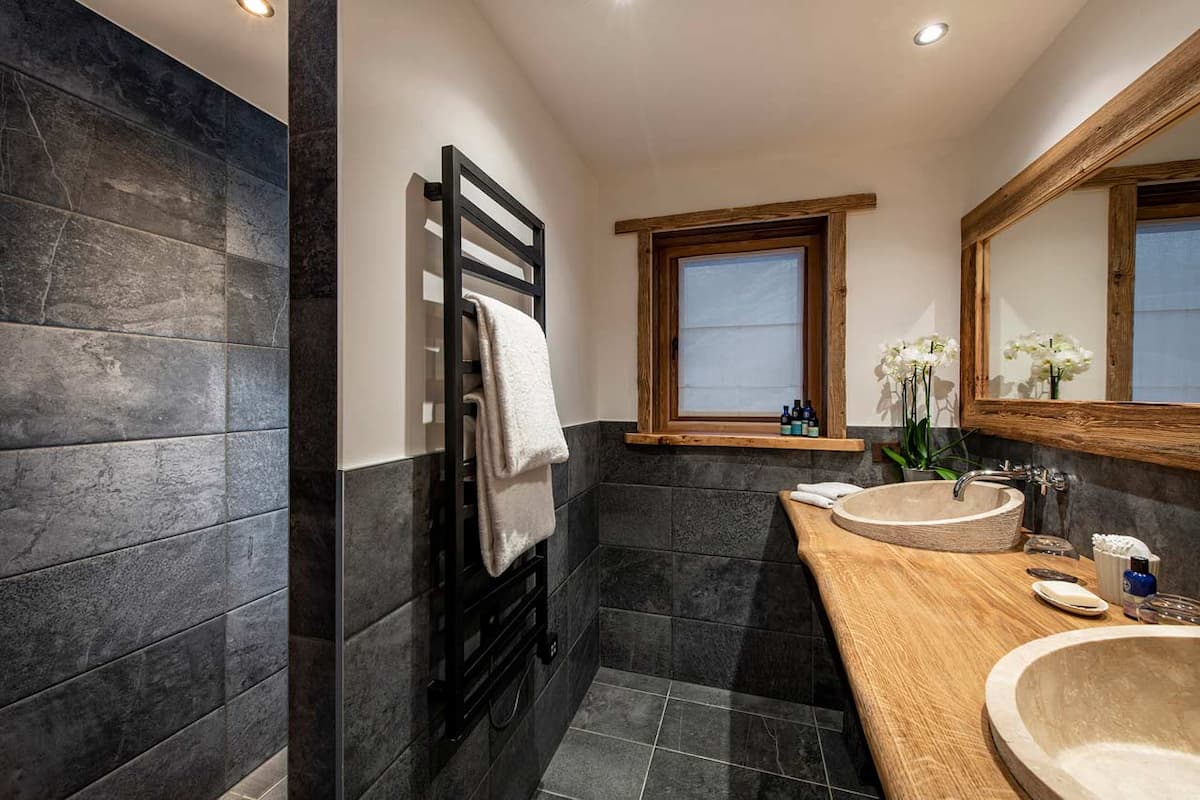 Val-197 can sleep 14 adults and 1 child across seven bedrooms, including a family suite. The top floor houses two master bedrooms, each with an en-suite bathroom and separate shower. The first floor features three additional double bedrooms, each with an en-suite bathroom or shower room, and a family suite comprising a double bedroom and a bunk room, which share a spacious en-suite shower room.