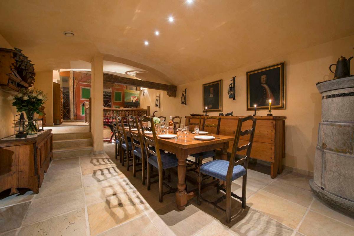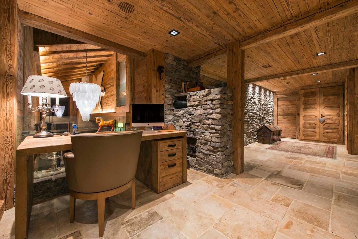 The chalet features two living areas centered around a majestic 18th-century stone fireplace, where guests can unwind on plush sofas or armchairs. Additionally, the ground floor houses a well-appointed kitchen and a refined dining area adorned with a stunning chandelier crafted from cascading glass petals.