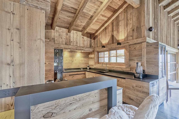 Spread across three floors, guests can luxuriate in a spacious living room featuring breathtaking vistas and a triple-sided fireplace. The dining area, accommodating 12, opens onto a terrace, ideal for savoring morning coffee amidst stunning scenery. An open kitchen with a wine cellar completes this floor.