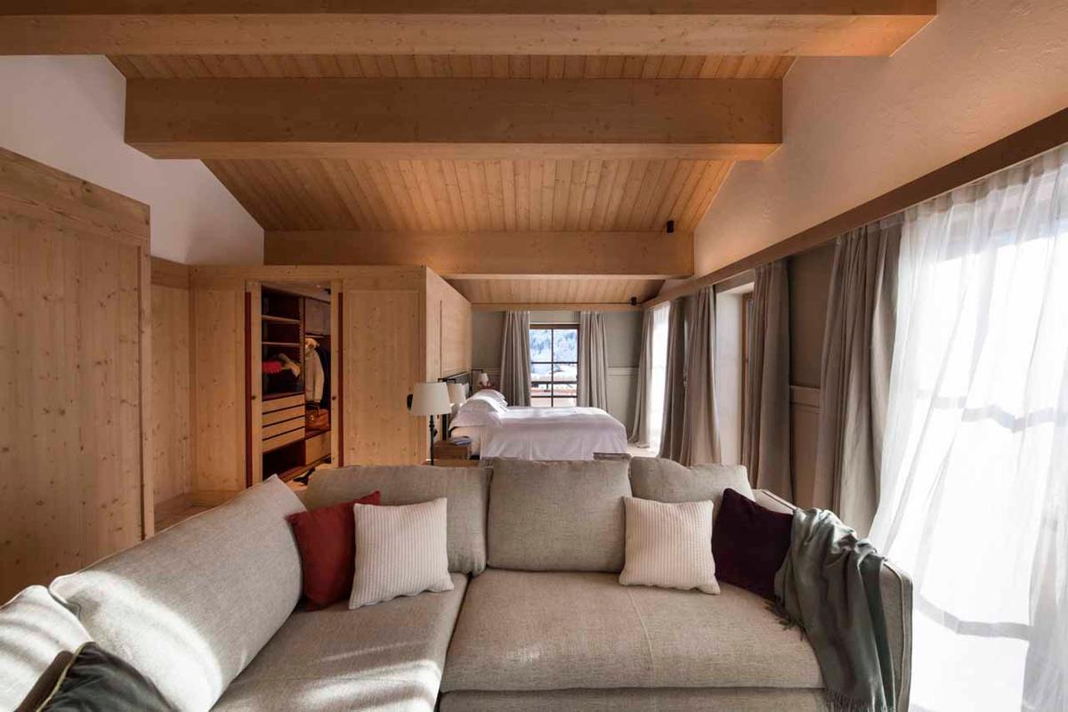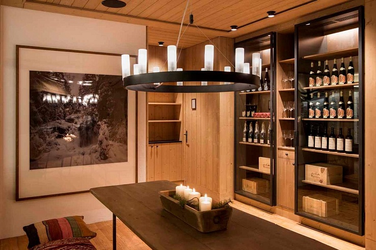The chalet benefits from a private elevator accessing all floors, a secure ski locker, and a wine cellar. A chauffeur service provides guaranteed access, transporting guests directly into the private garage.