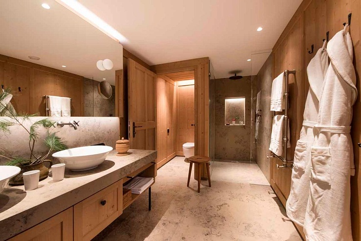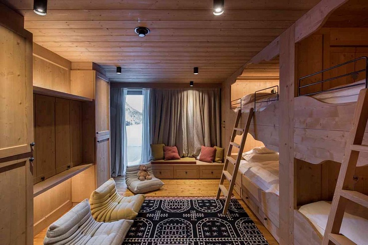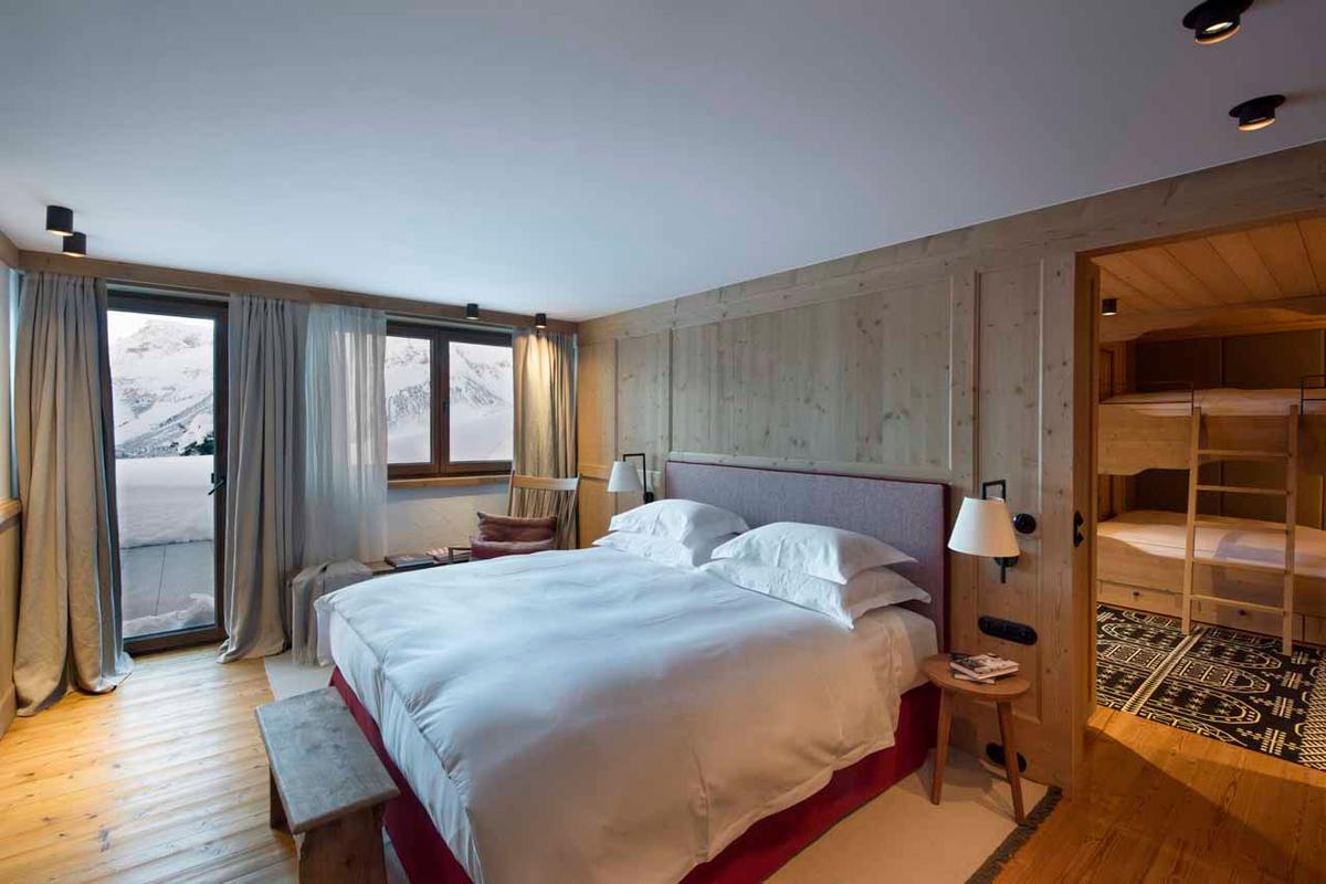 Lech461’s accommodation is thoughtfully arranged across its floors. The top floor houses the magnificent master suite, complete with a vaulted ceiling, private balcony, lounge area with a fireplace, a dressing room, and a luxurious en-suite bathroom. Another double bedroom with a balcony and en-suite shower room also resides on this level. The ground floor contains the remaining bedrooms: two well-appointed double rooms with en-suite facilities, a charming children’s bunk room with two bunk beds (sleeping four) with its own bathroom, and a further double bedroom that connects directly to a separate bunk room (sleeping two), making it an ideal family suite. Every bedroom is equipped with en-suite facilities.
