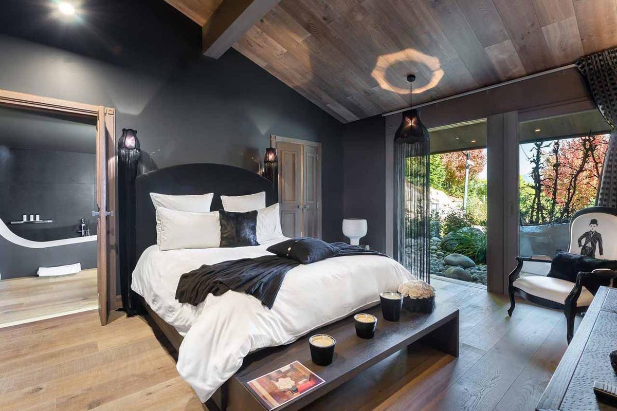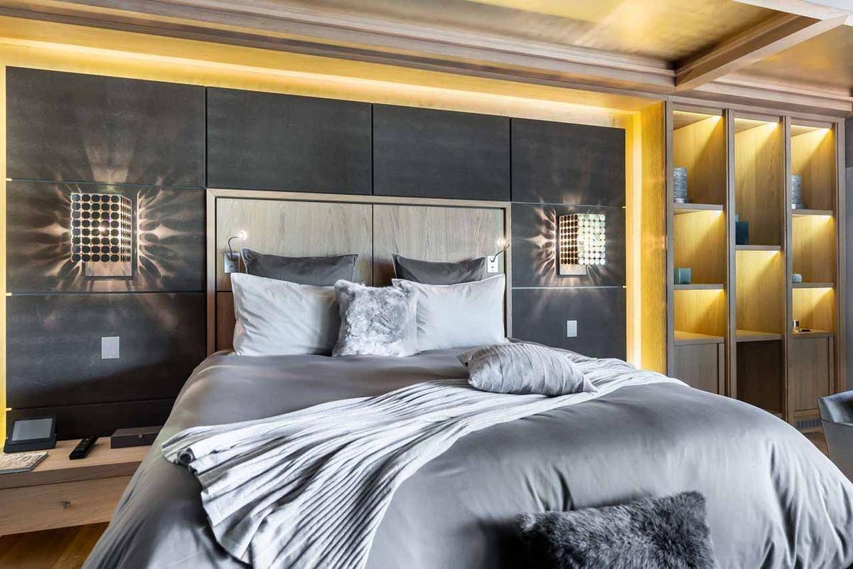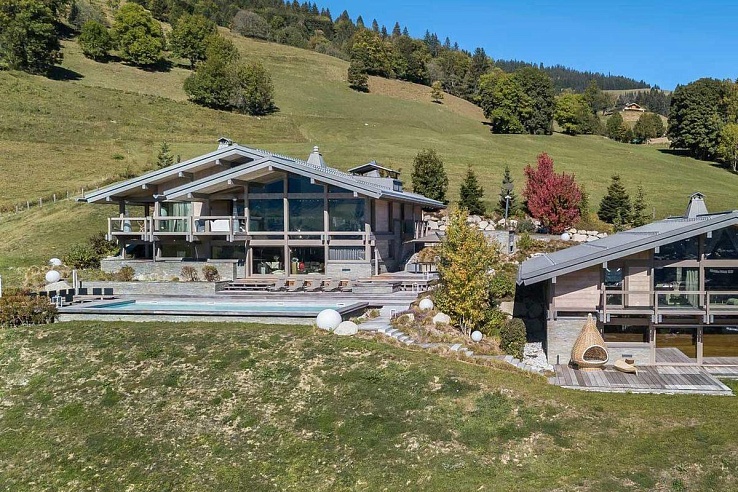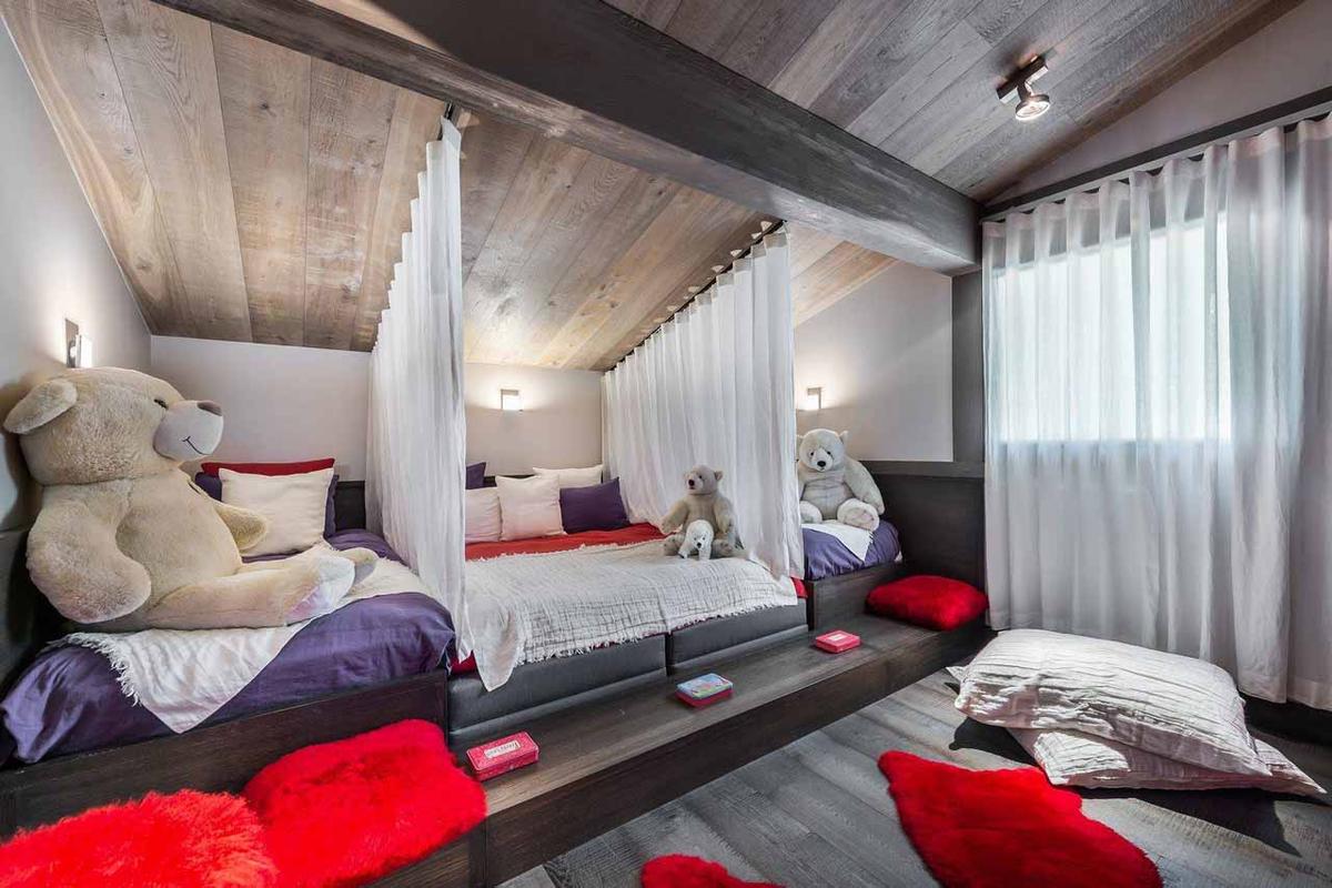 The main chalet hosts a luxurious master suite with a dressing room and three en-suite double bedrooms. In the guest chalet, there are two additional double en-suite bedrooms, along with a children’s room featuring four beds and an en-suite bathroom. The guest chalet also offers a second living room, dining room, open kitchen, a reading corner, and a play area suitable for adults and children alike.